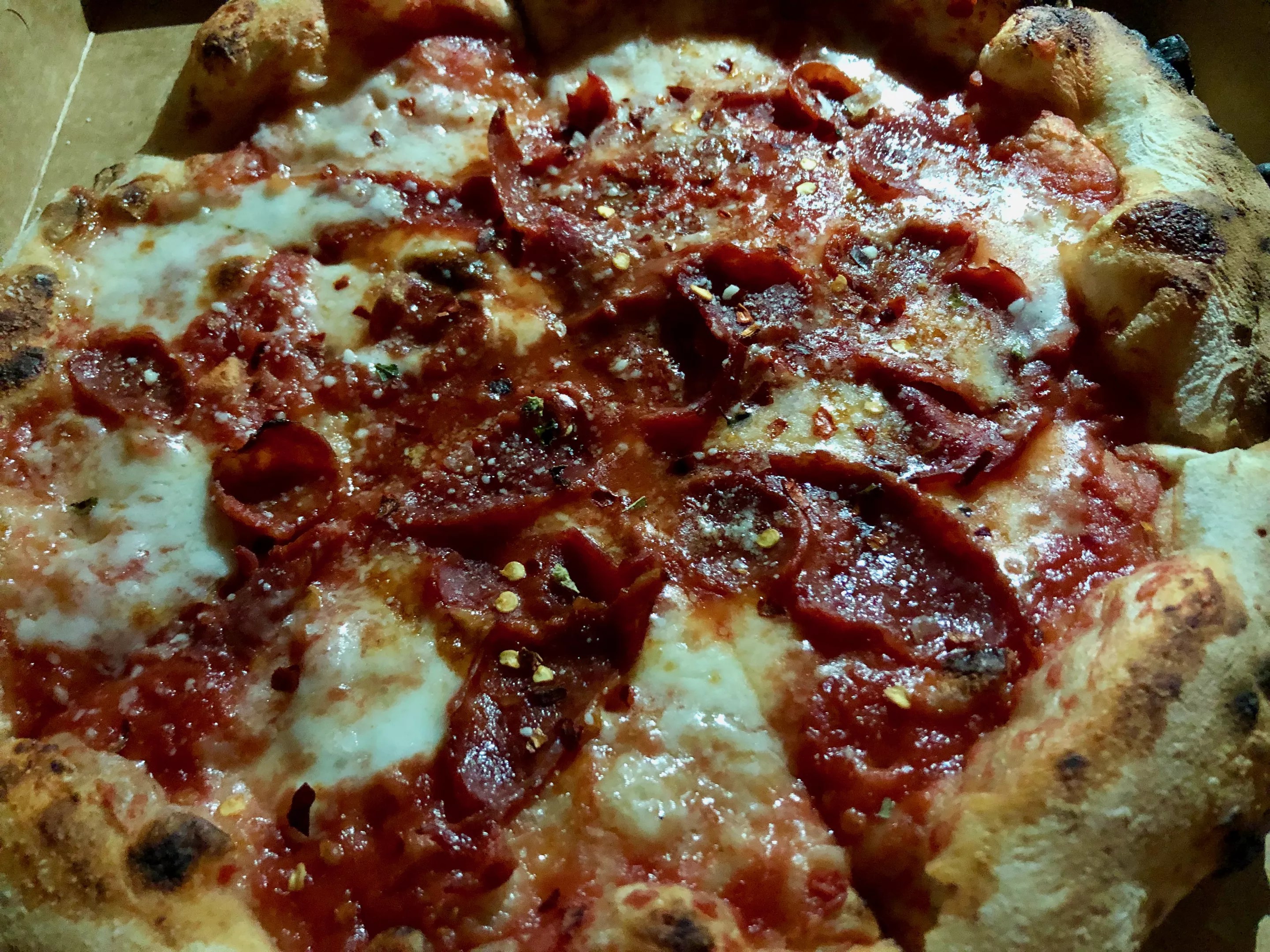 The pizza is chewy, salty, and hot. The thin pizza is weighed down by a generous amount of tasty toppings of tomato and cheese, which is appreciated considering some Neapolitan-style pizza places love to lay it on light. The salami adds more chew, the basil some fragrance.