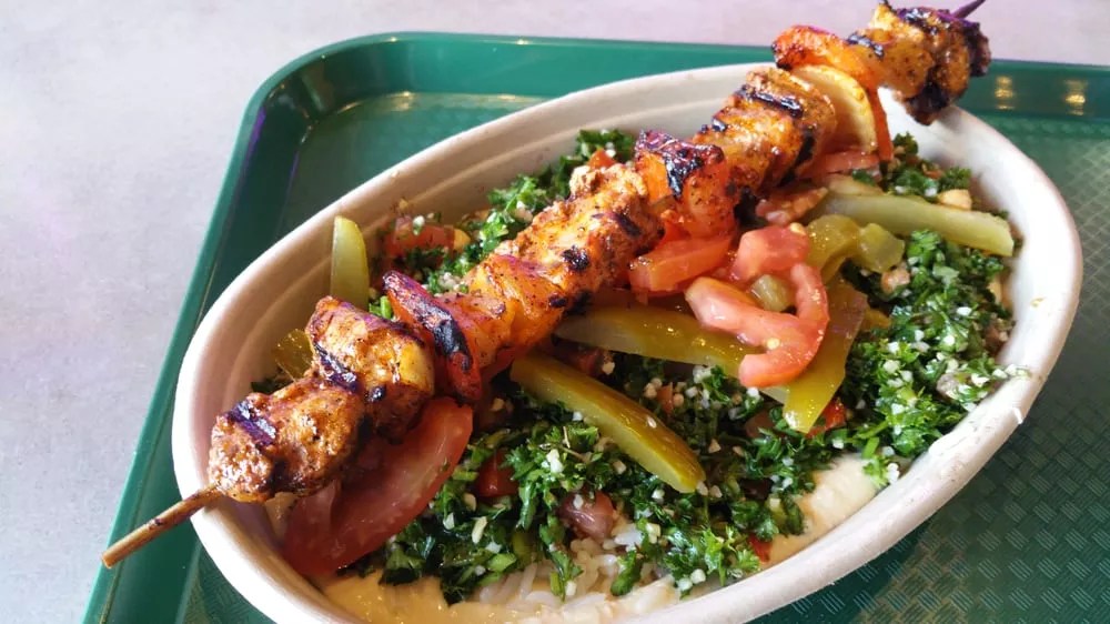 The protein options are tofu, falafel, za’atar steak, chicken kebob, gyro and Chicken Shawerma.