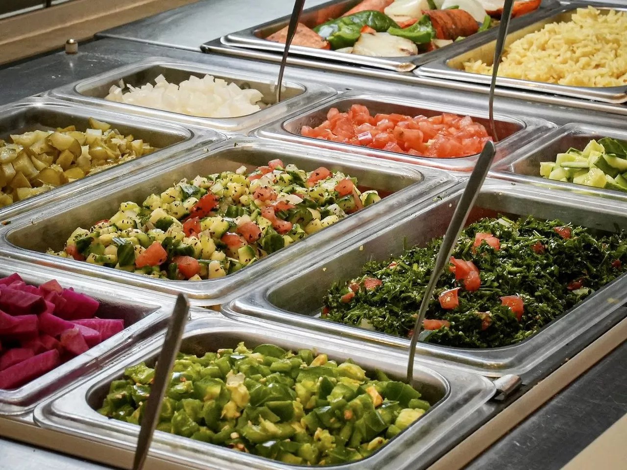 As customers move through the line, they can customize their dishes as they are made.