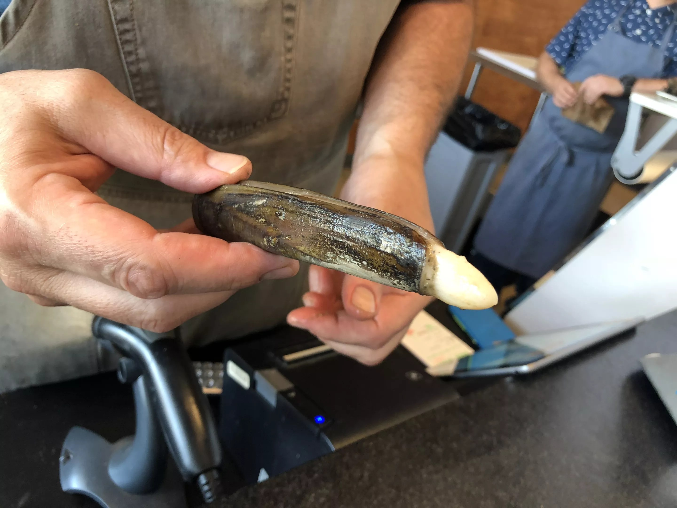 Razor clams came chopped up in the hollow of their long shell. Before the chopping, the clam, overnighted in from Massachusetts, was alive, sticking its foot out into the air.
