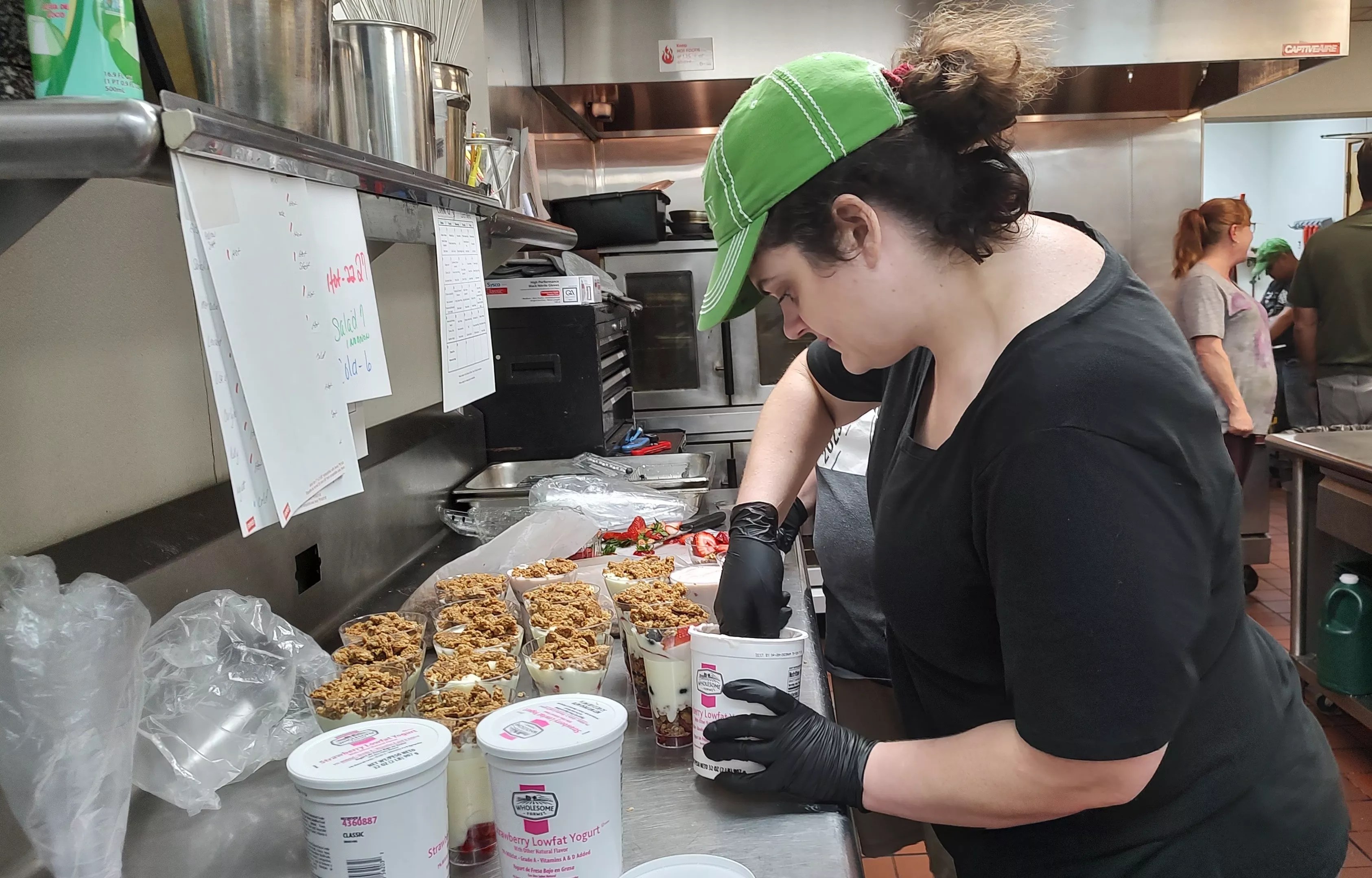 “I do food prepping and I like peeling potatoes [and] bagging veggies,” Sleiman says. “I like the mushrooms and potatoes. Yesterday, they brought us doughnuts. They make us lunch on break. By the way, the people are good.”