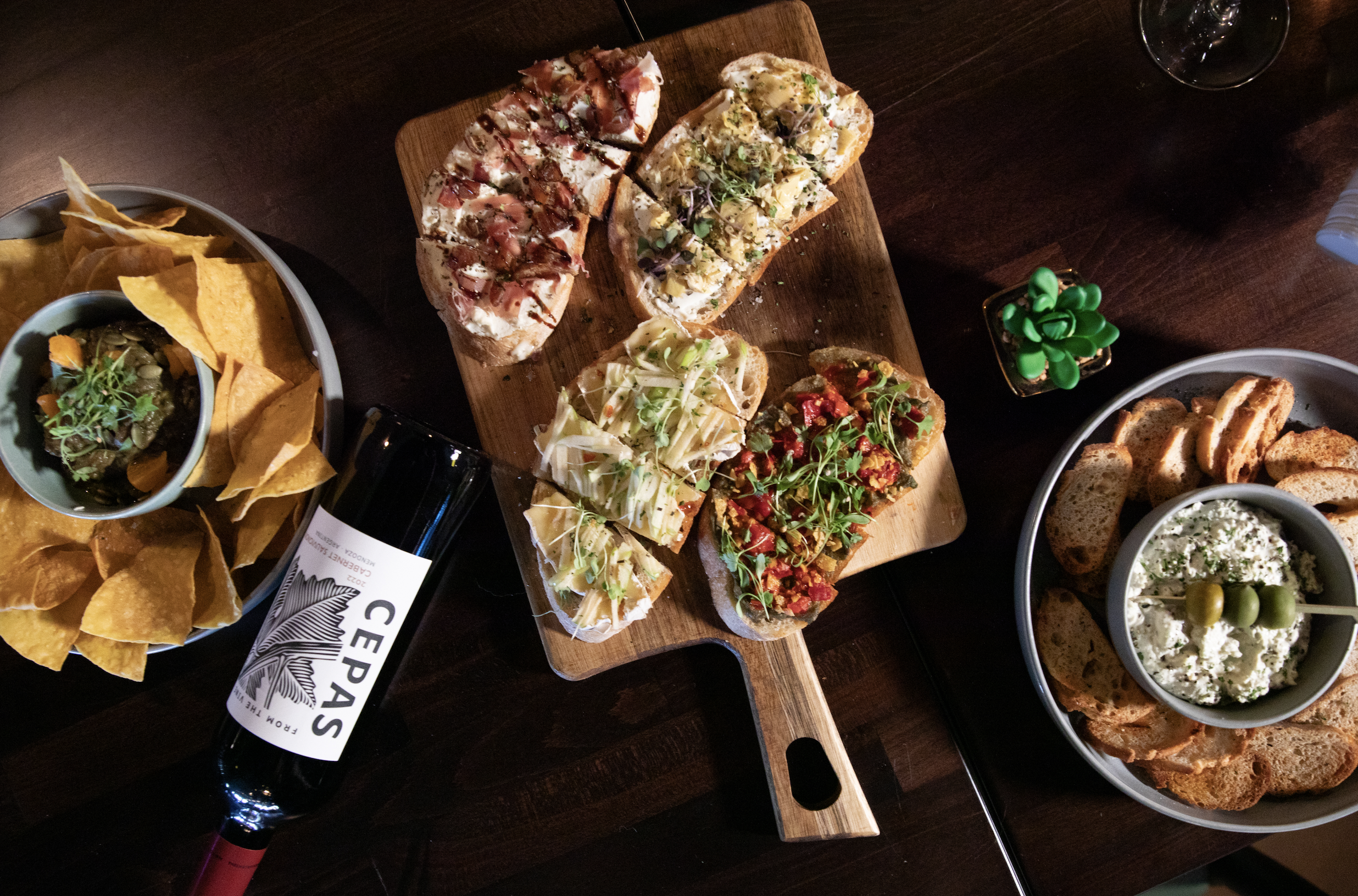 The shareables menu includes a variety of bruschettas and dips.