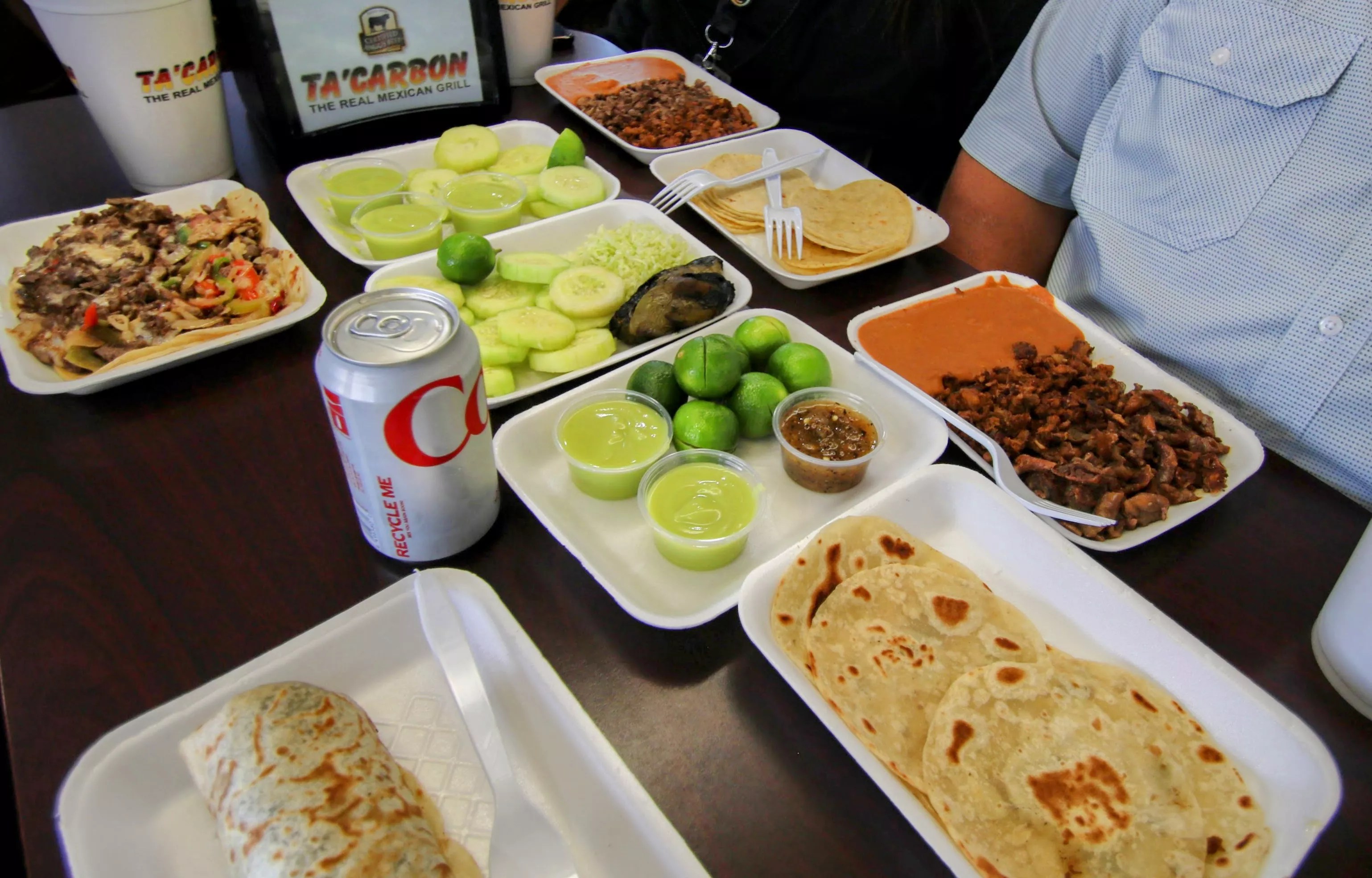 Ta'Carbon specializes in carne asada, but also offers other types of meat including cabeza, al pastor, tripas, barbacoa, campechano, and huevos de becerro.