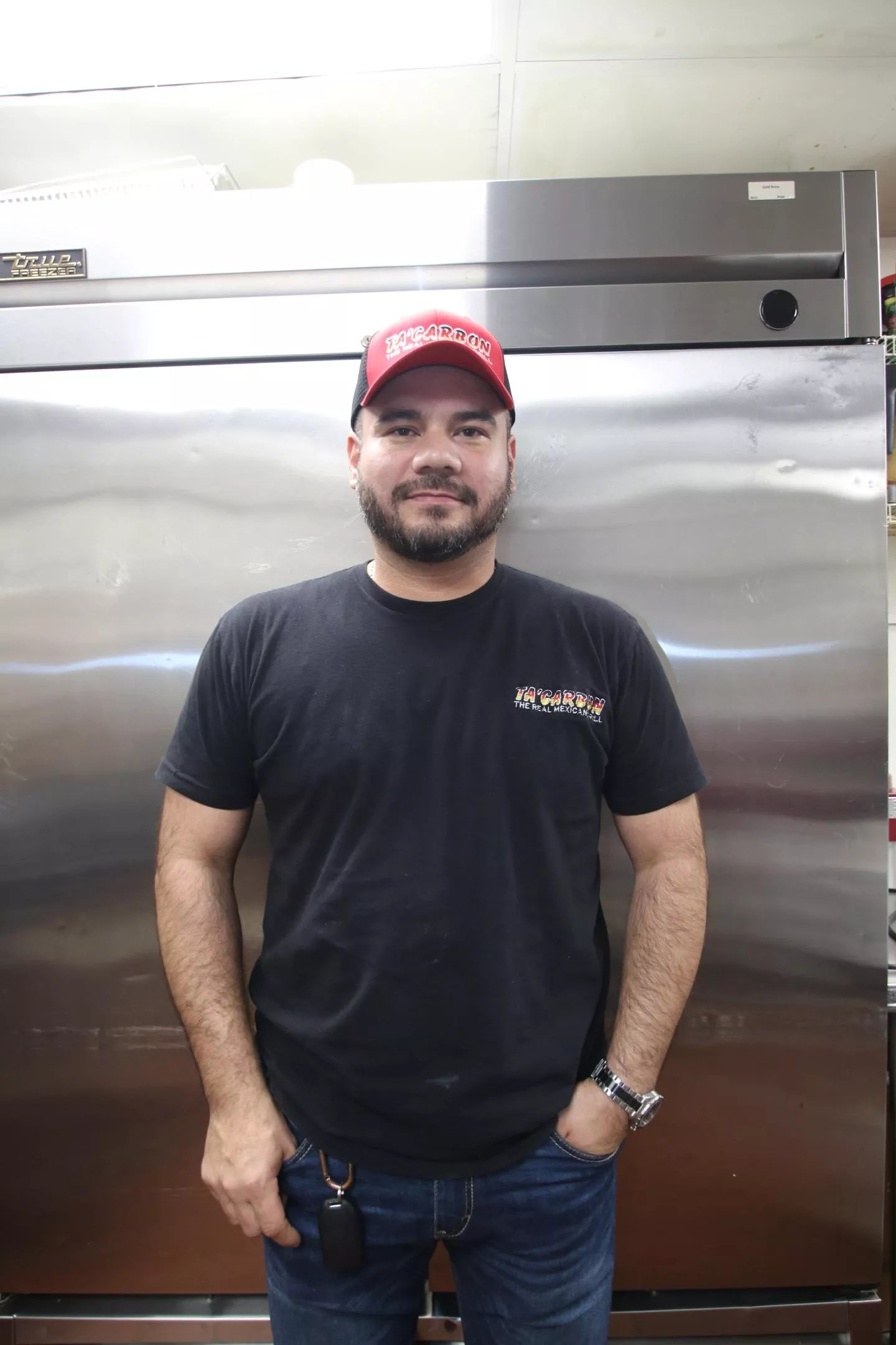 Carne asada is generally grilled flap, flank or skirt steak. At Ta’Carbon, “it’s CAB: certified Angus beef,” Aldecoa explains while opening and entering a walk-in freezer and showing the labels affixed to the large beef portions. “It’s the Prime brand at the top of the pyramid of quality.”