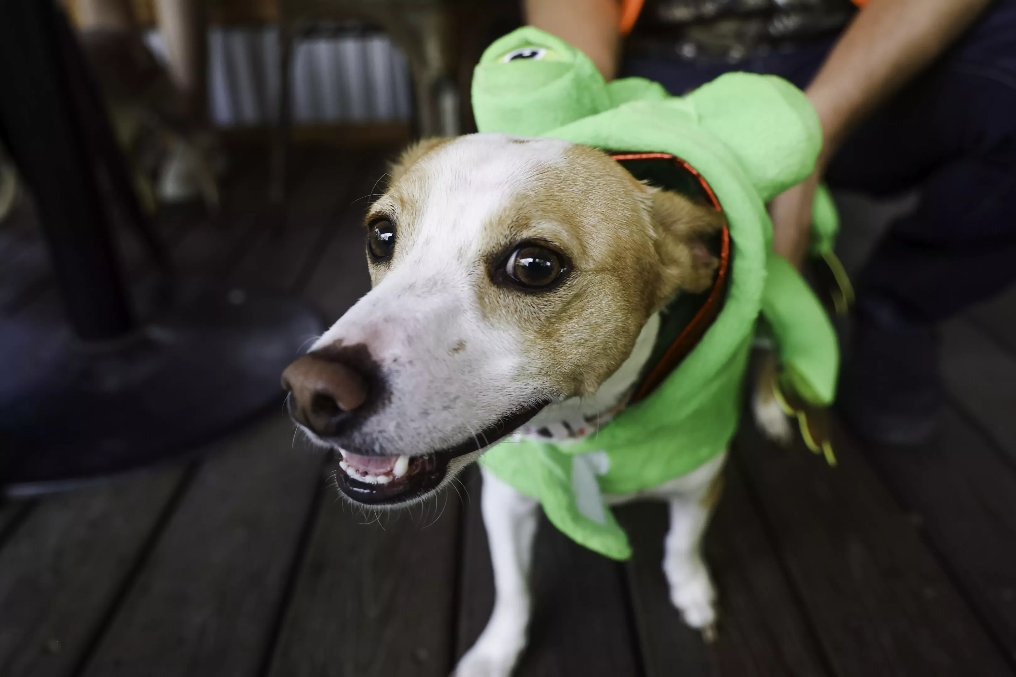 Wrenly-Rose, a 2-year-old Jack Russell terrier mix, dressed as a frog.