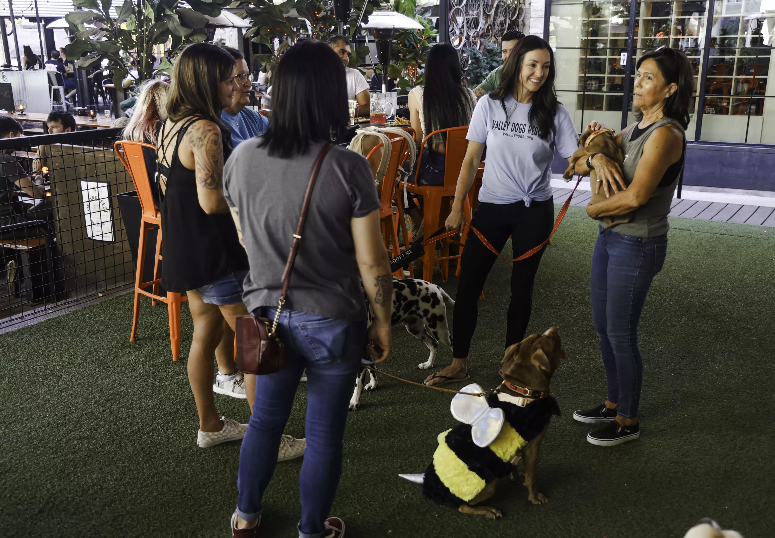 Attendees and volunteers from Valley Dogs Rescue converse while enjoying the company of dogs in Halloween costumes at Pedal Haus Brewery in Tempe.