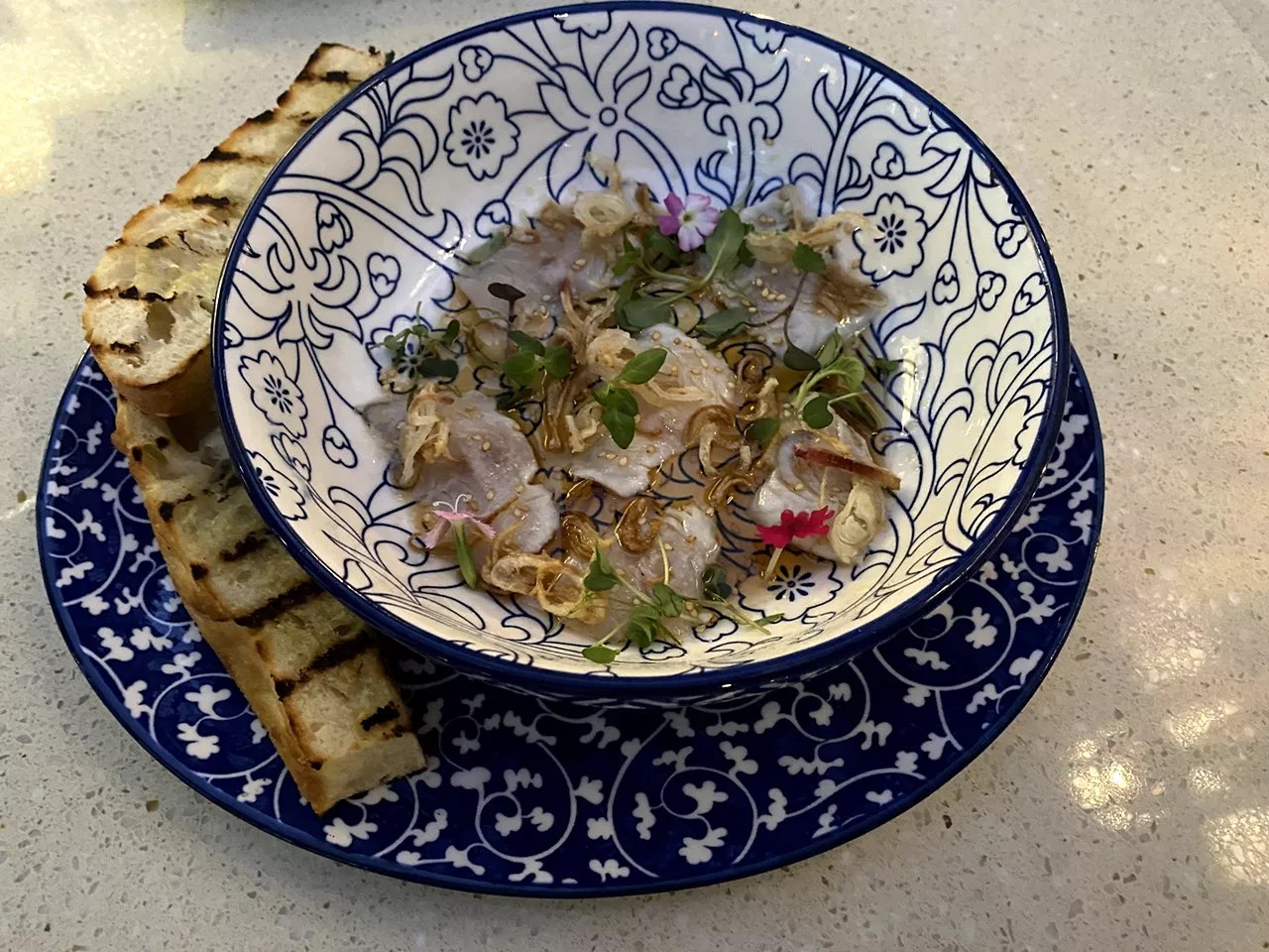 The restaurant is located in the heart of Old Town Scottsdale, across the street from the Rusty Spur Saloon and set back behind shops selling $10 sunglasses and hats. However, it’s tucked away from the tourists-and-clubs chaos, with a serene, expansive patio featuring black metal chairs and white manufactured stone tabletops. While the patio seats 44, the indoor dining room holds only 24 seats and eight barstools, along with a totally open kitchen. Branzino crudo is served with fresh focaccia. Geri Koeppel