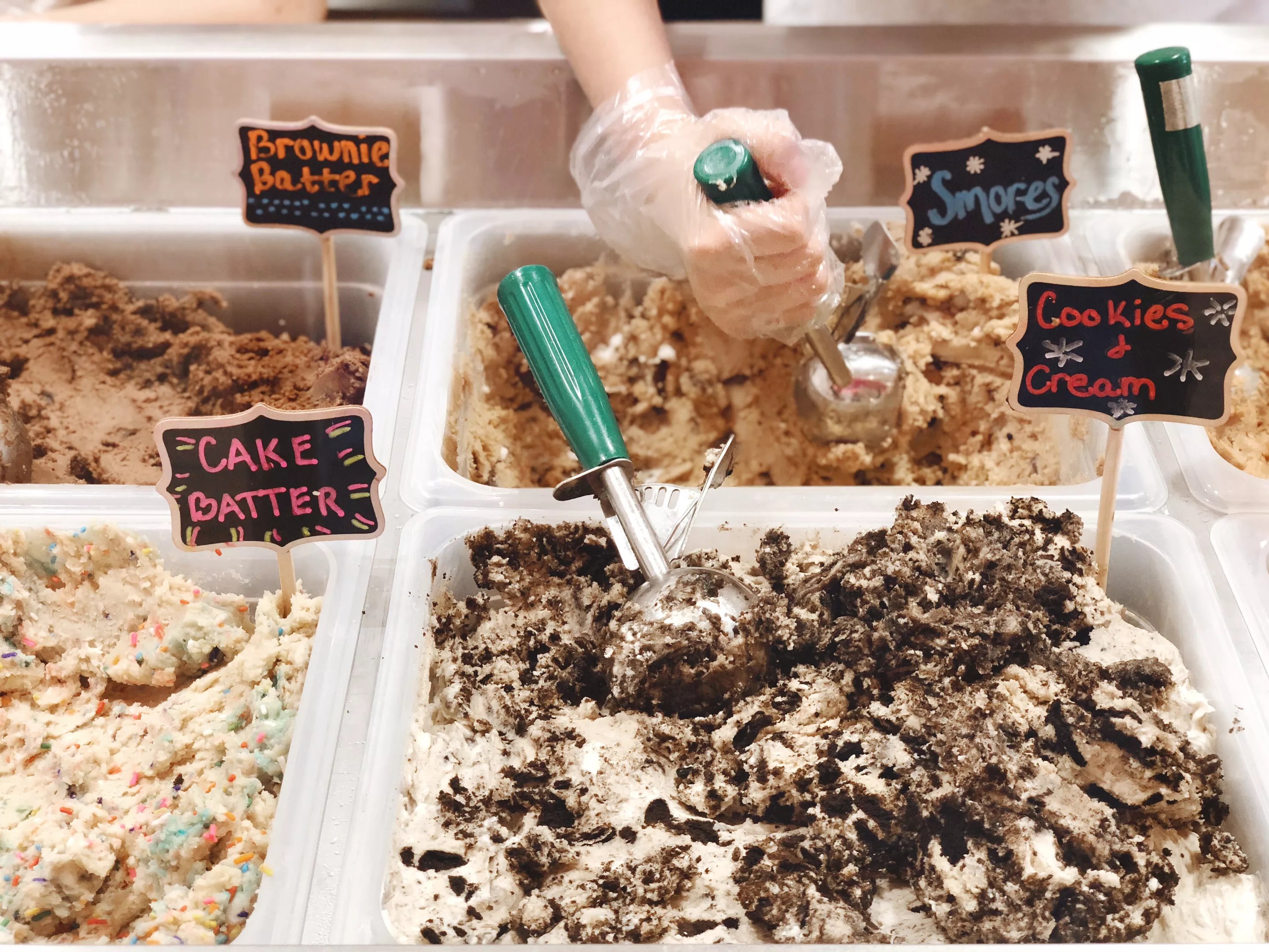 A staff member at Unbaked scoops raw cookie dough. All staff are trained to answer questions about each recipe.