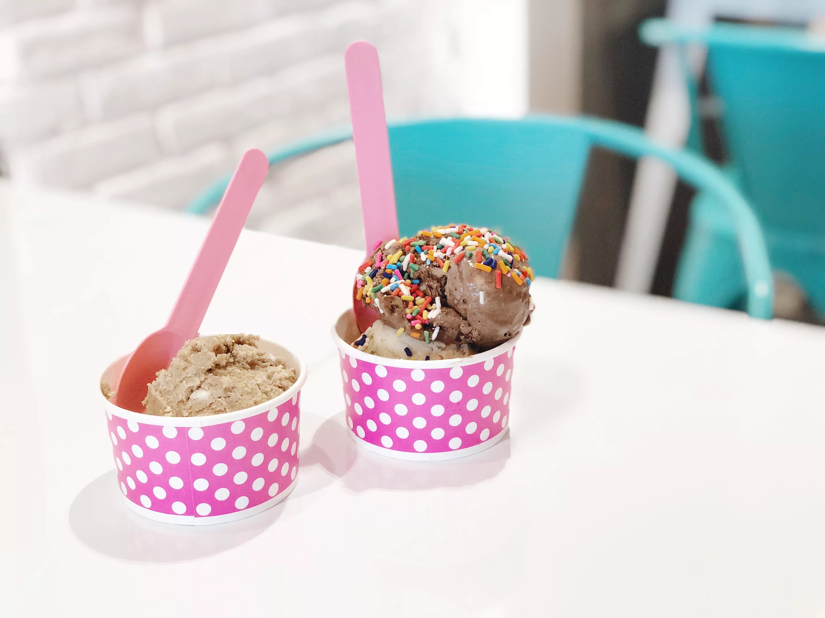 A scoop of gluten-free oatmeal cinnamon dough, left, and sugar cookie dough topped with double chocolate malt ice cream and sprinkles, right.
