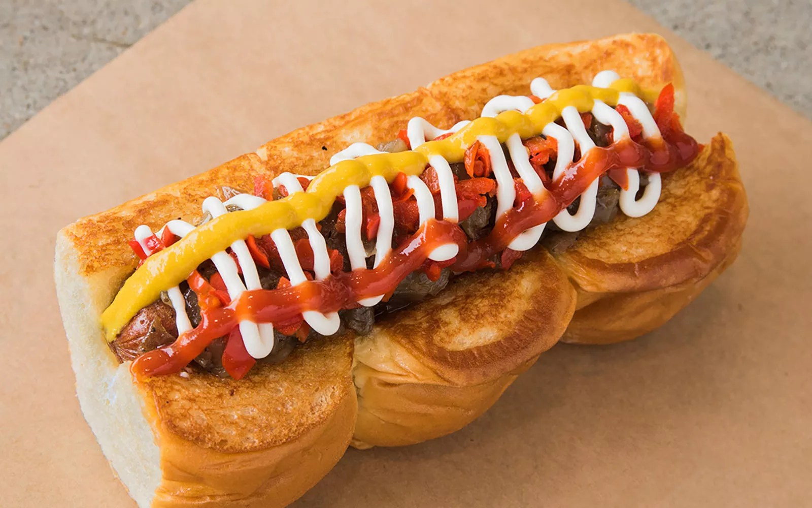 Loaded dogs are piled high with toppings at Dog Haus Biergarten in downtown Phoenix.