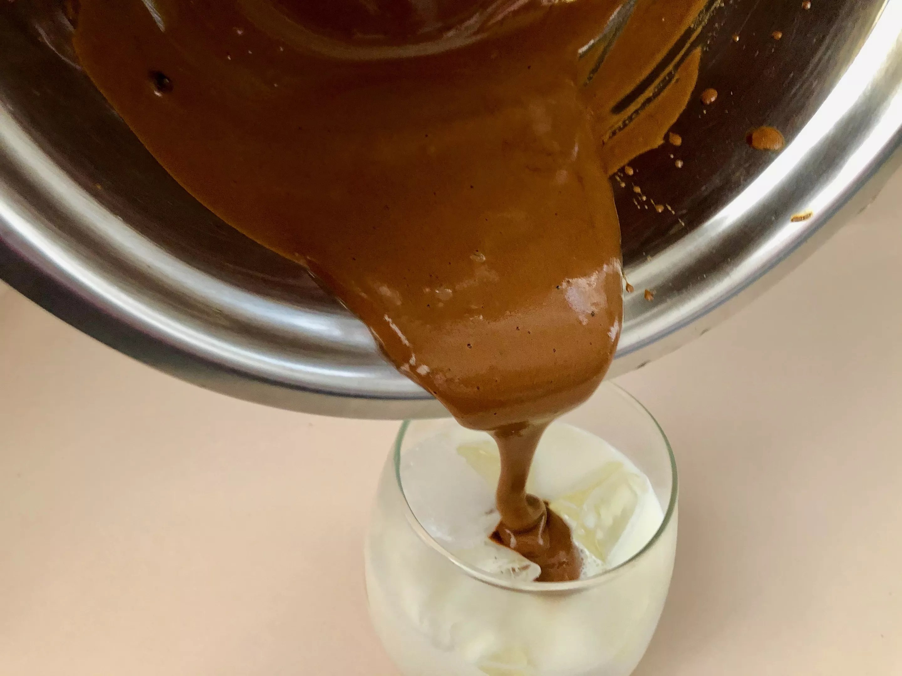 Standing by, have a rocks glass filled with ice and the Danzeisen Dairy milk at the ready. Once your dalgona topper is nice and frothy, gently pour the caffeinated foam over the milk. Then, final step, take as many photos as possible,. Because if you didn’t share your creation online in 2020, did you even make dalgona?