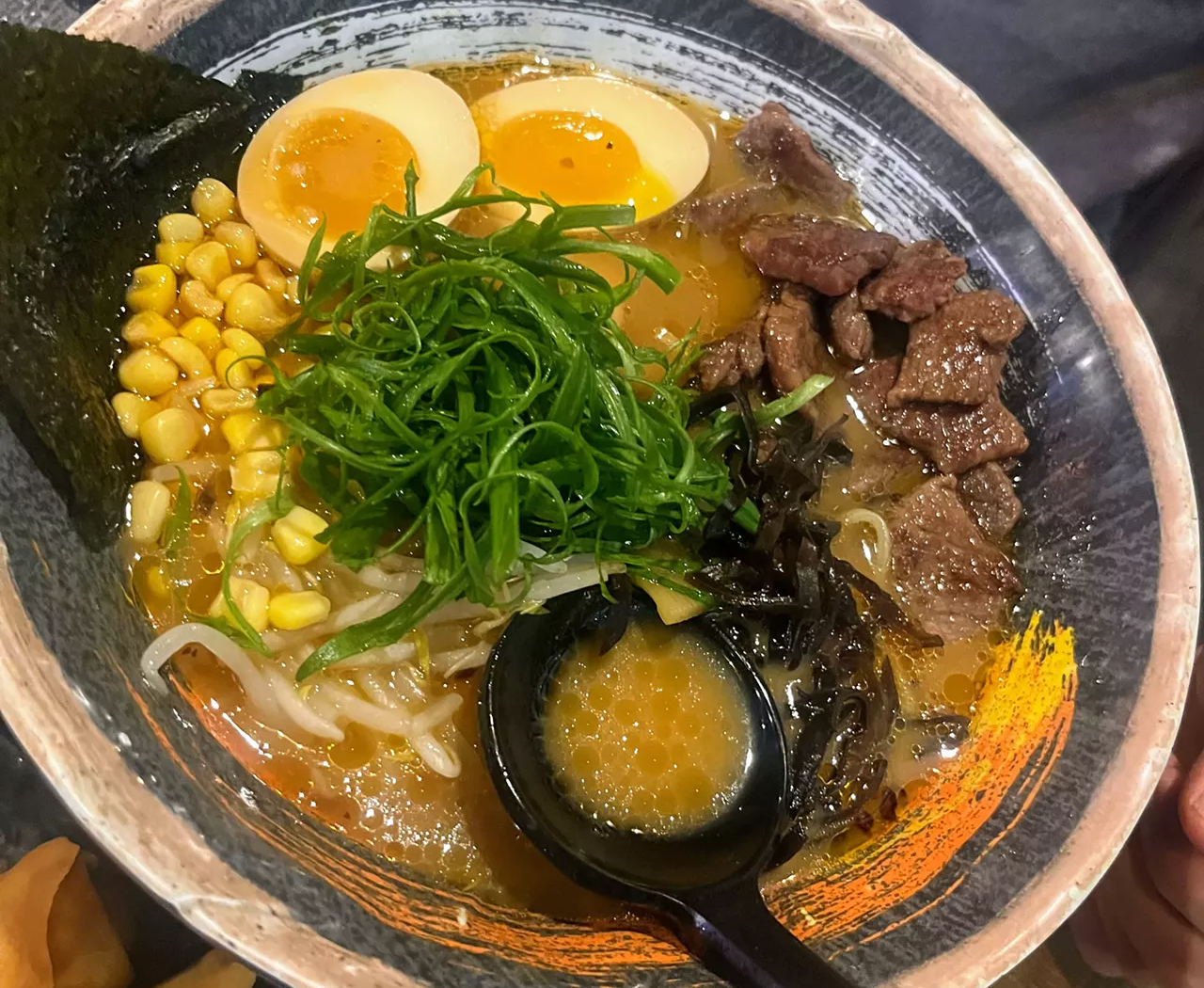 One standout item is the Wagyu ramen bowl, a fan favorite. It’s packed with chunks of beef, a boiled egg, wood ear mushrooms, seaweed, bean sprouts and green onions in a chicken-based broth. Customers can choose between thin or thick noodles and select from five spice levels, ranging from none to extreme.