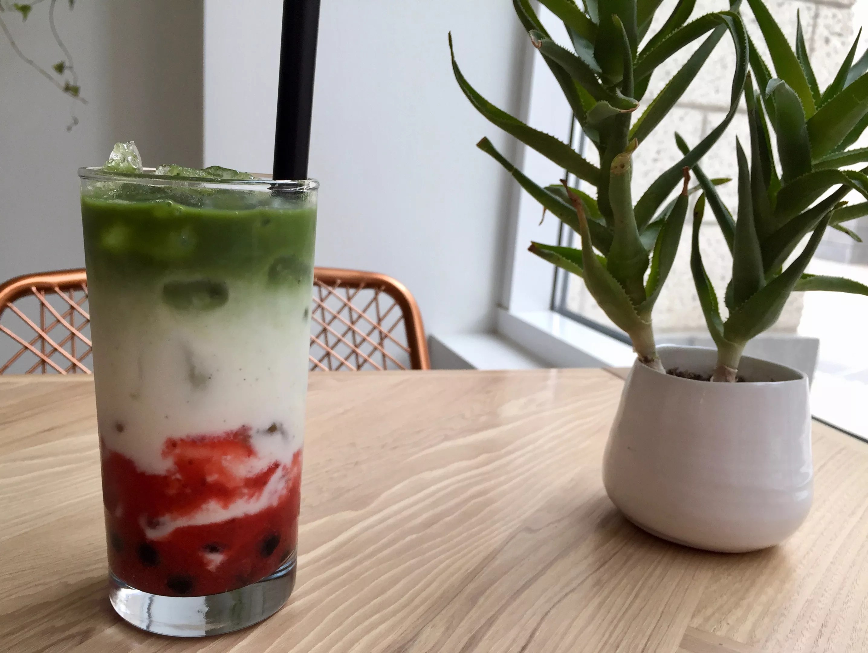 The Strawberry Matcha is fresh strawberry puree, matcha tea, and Danzeisen Dairy whole milk –