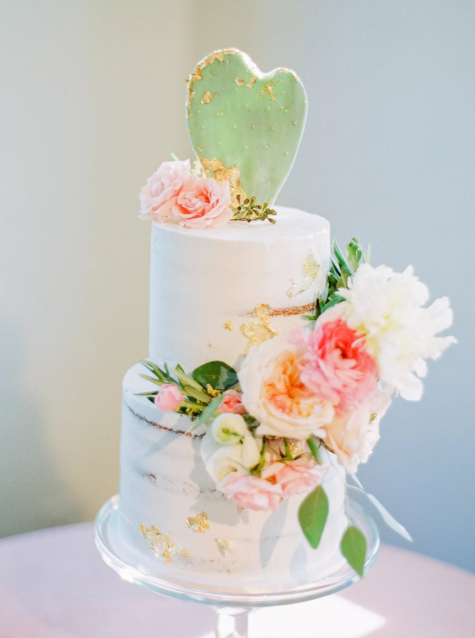 The idea for the cactus cake came after baking for a wedding, when Jessica spotted heart-shaped prickly pear paddles at the venue. She spent six months pitching the idea to her mom. Finally, her mom agreed to make the cake. It features a realistic cactus paddle made from sugar paste. Its stickers are nubs of hard spaghetti. Gold leaf gleams sparsely across the cake. A slash of fresh flowers and leaves, often from Camelback Flower Shop, curls down the frosted white slopes.