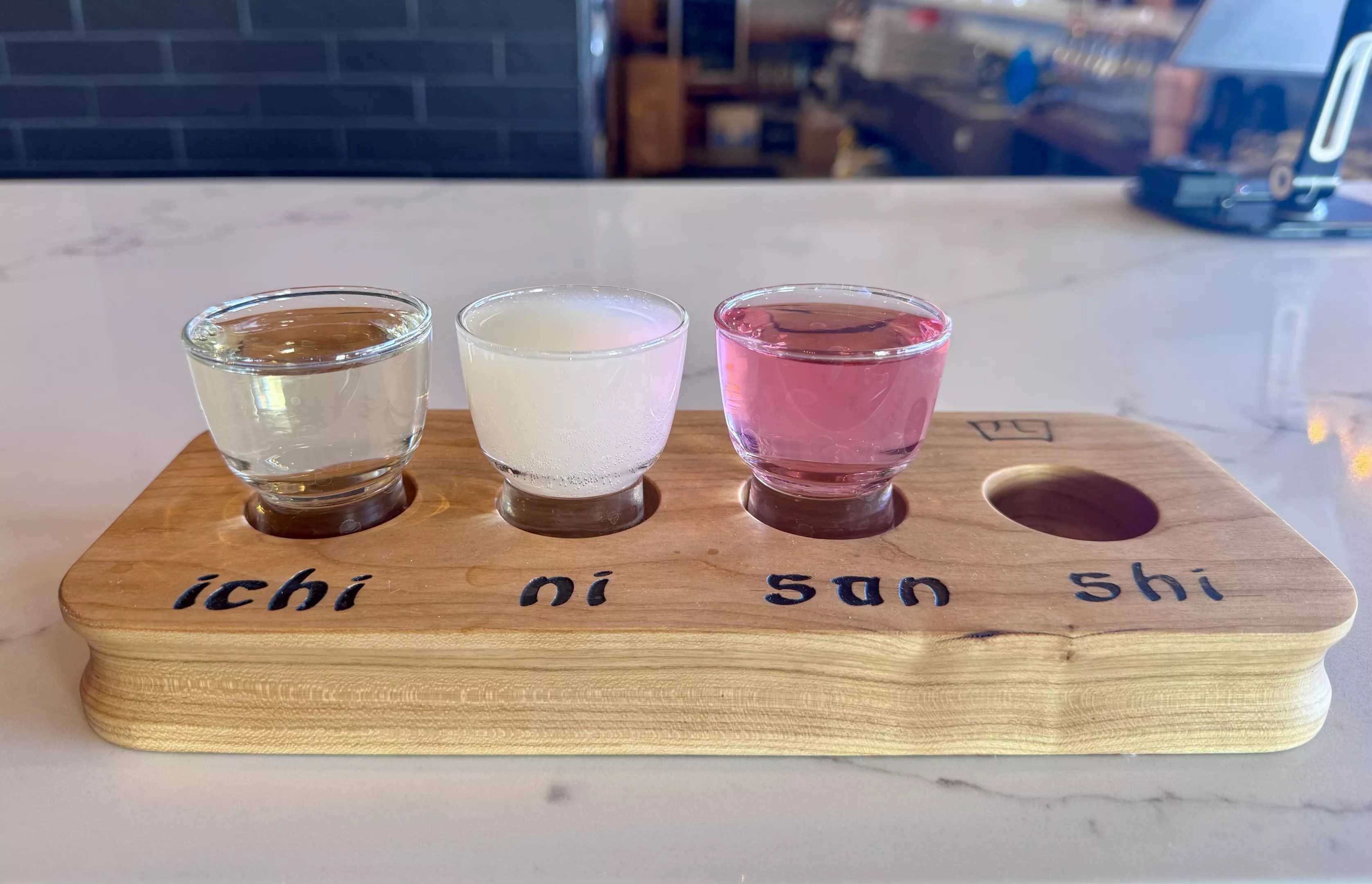 Kitsune carries three of Arizona Sake’s rice wines. From left, Arizona Sake’s standard Junmai Ginjo sake, Desert Snow, a sparkling, unfiltered sake with a milky white hue, and a version with prickly pear.