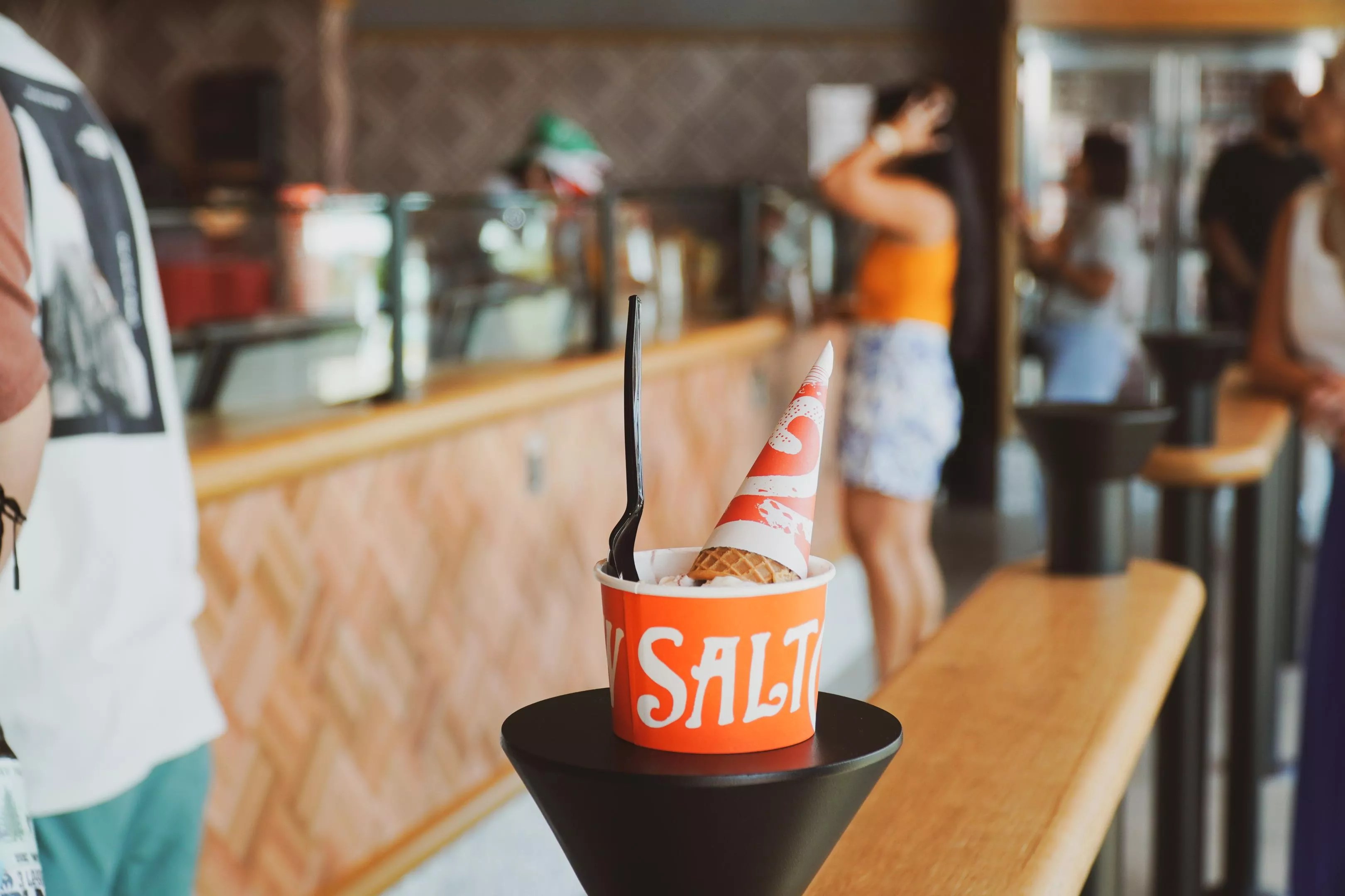 Salt & Straw officially opens at Epicenter on Friday. On Thursday, the new shop hosted a sneak peek celebration with umbrellas popped and misters blasting. Inside, it was all smiles and samples as eager ice cream fans bellied up to the counter to try mini spoonfuls of wild-foraged berry slab pie and pear and blue cheese ice cream flavors.