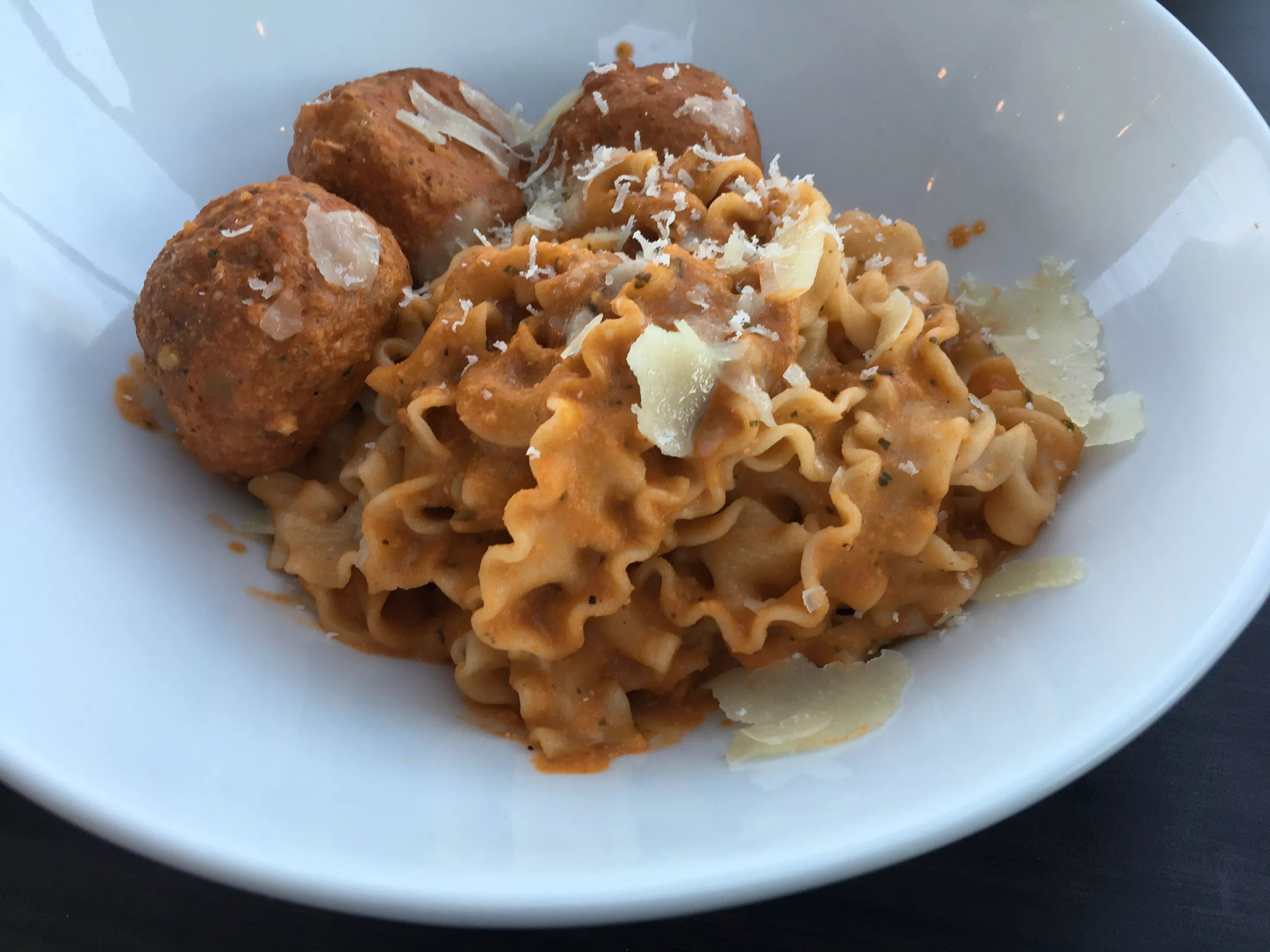 Our tuna meatballs came in almond pesto with wide ribbons of mafalde pasta. I absolutely wanted to like the meatballs, to have them smash my philosophy and change my approach. But they weren’t the best. They were dry, and I couldn’t find the pine nuts and raisins the menu had promised were inside. My mafalde, too, lacked the bite of good pasta. The sauce, blusher and creamier than expected for a pesto (even one without leaves), had congealed some by the time it got to me.