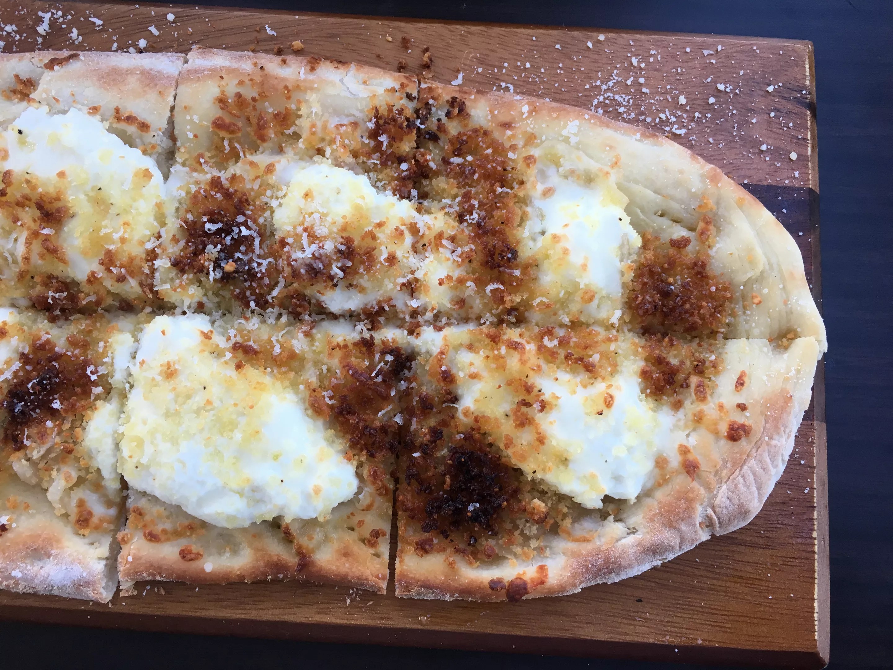 We also ordered sfincione, one of the restaurant’s many flatbreads. The compact bread was about one-third the thickness of the ricotta dollops on top. Breadcrumbs were showered on so thickly that they browned out the ricotta in some places. Breadcrumbs are an ace in the old-school Southern Italian culinary deck, adding salt, toasty flavors, and crunch for little cost. And that’s just what they did here. They made the sfincione, lending a shattering foil to the soft and creamy ricotta. Sautéed onions brought a sweet dimension. Colatura, an Italian fish sauce, could hardly be tasted.