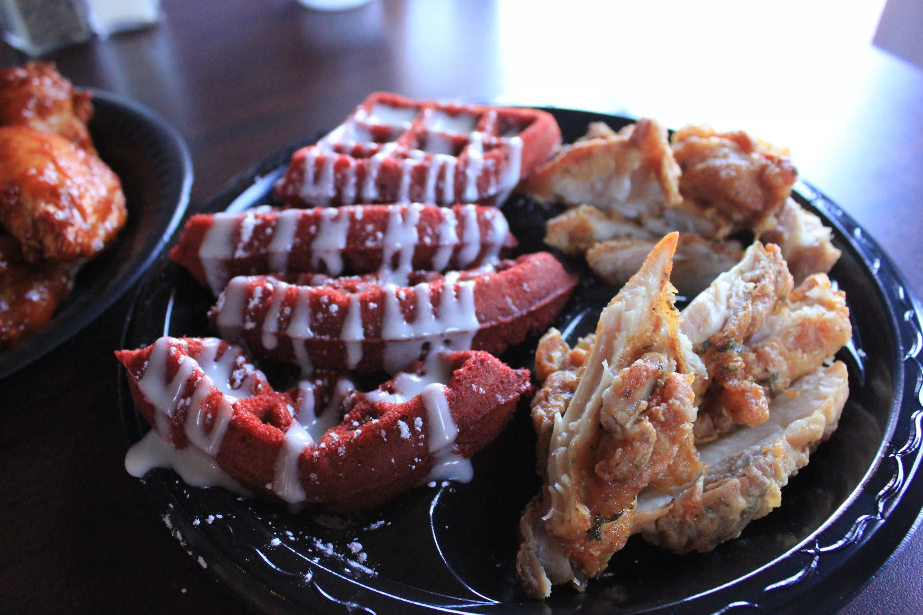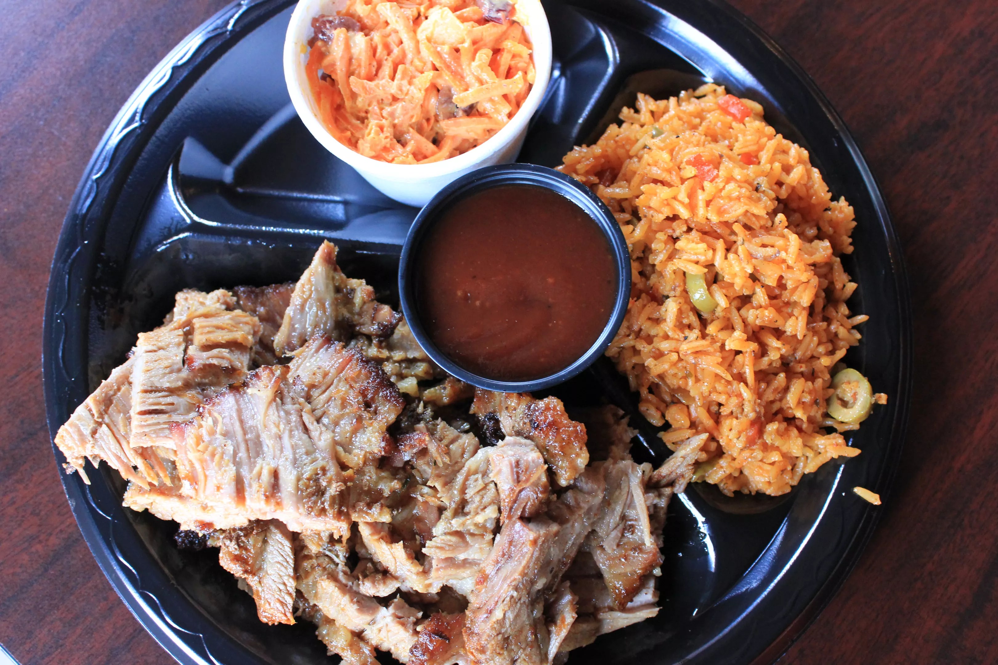The food is a mash of soul food, comfort food, and barbecue, three cuisines that heavily overlap. Soul elements include fried shrimp and fish, chicken and waffles, and collard greens. Rhema also shows Caribbean influences, like rice with green olives and peppers, and jerk spices in barbecue sauce – a nod to Via’s Jamaican heritage. Rhema uses three generations of recipes on both sides of the family.