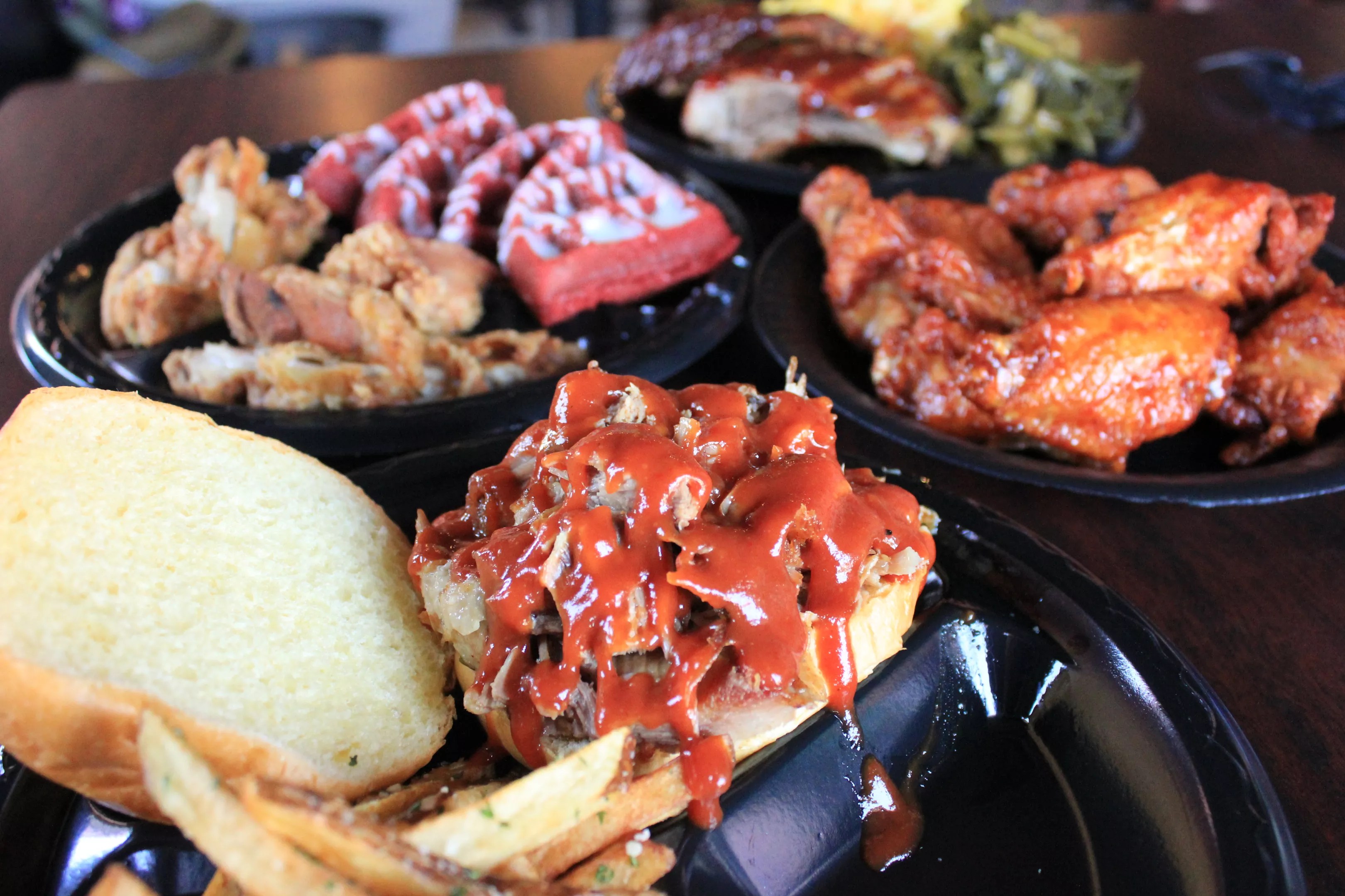 Lots of barbecue and soul food, a chopped pork sandwich in front.