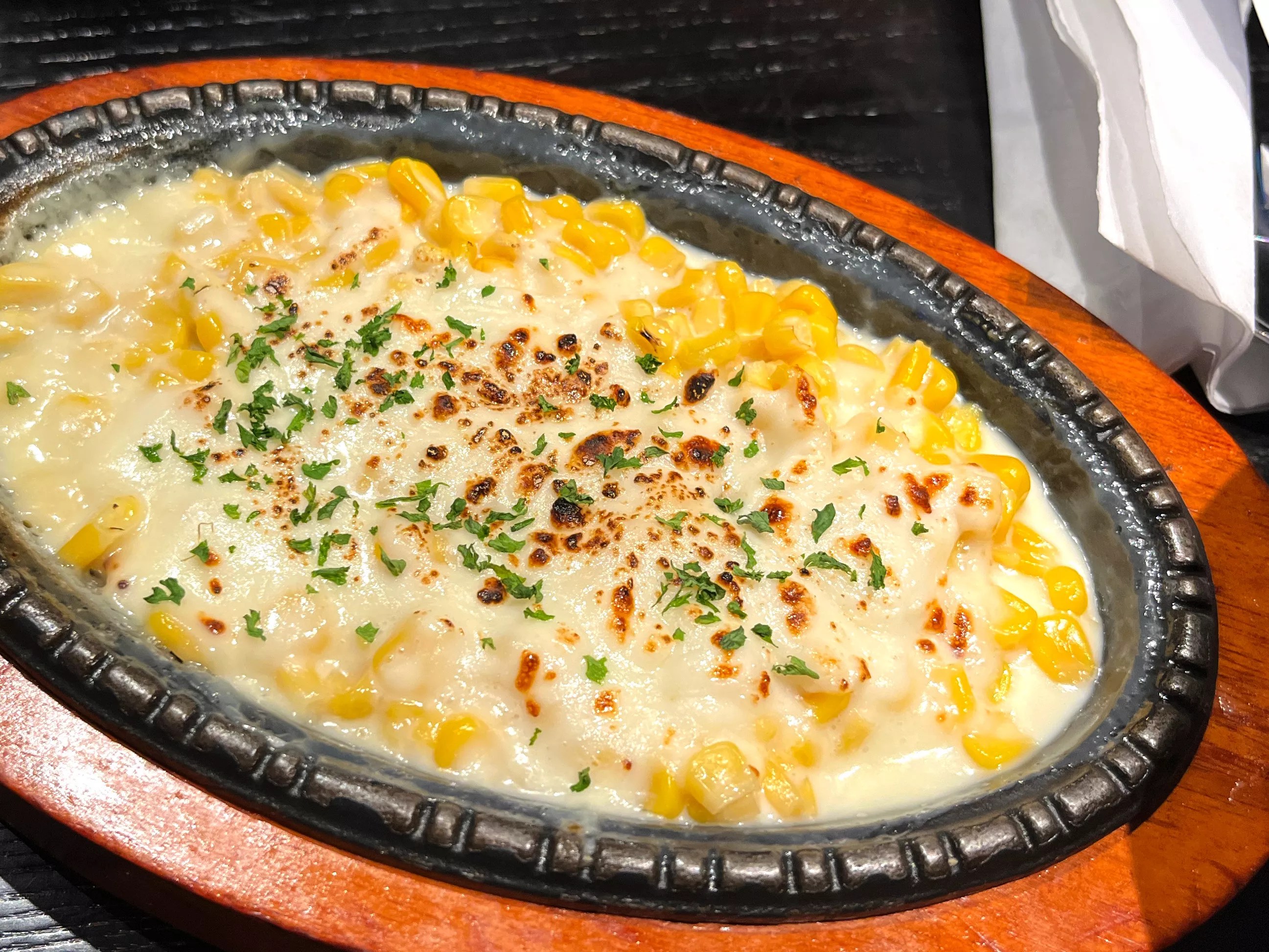 Corn cheese, speaking broadly, holds the dubious distinction of somehow working magic with canned corn, and this one’s an unusually good specimen, served bubbling hot on a cast iron plate smothered with mayonnaise, mozzarella, and plenty of sweet onion.