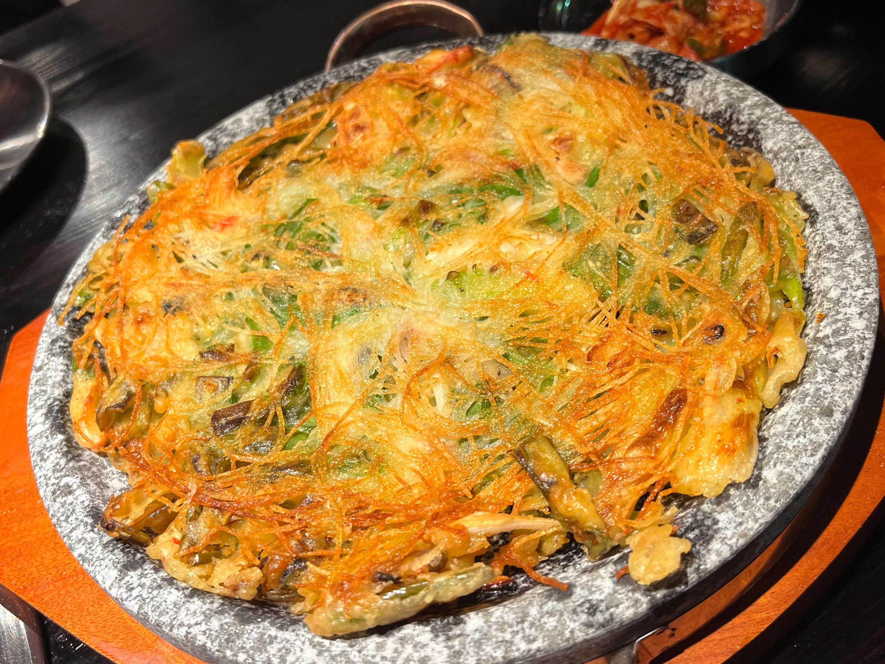 We all know why you came, but please, do yourself a favor and give the rest of the menu a gander, too. The supporting dishes are some of Smoking Tiger’s best, starting with a dynamite seafood pancake. One of my favorites in town, this is an extra robust and crispy variety, strewn with griddled green onions and loaded with sweet shrimp and tender squid. Smoking Tiger makes an excellent seafood pancake, big and crispy, filled with tender shrimp and squid. Dominic Armato