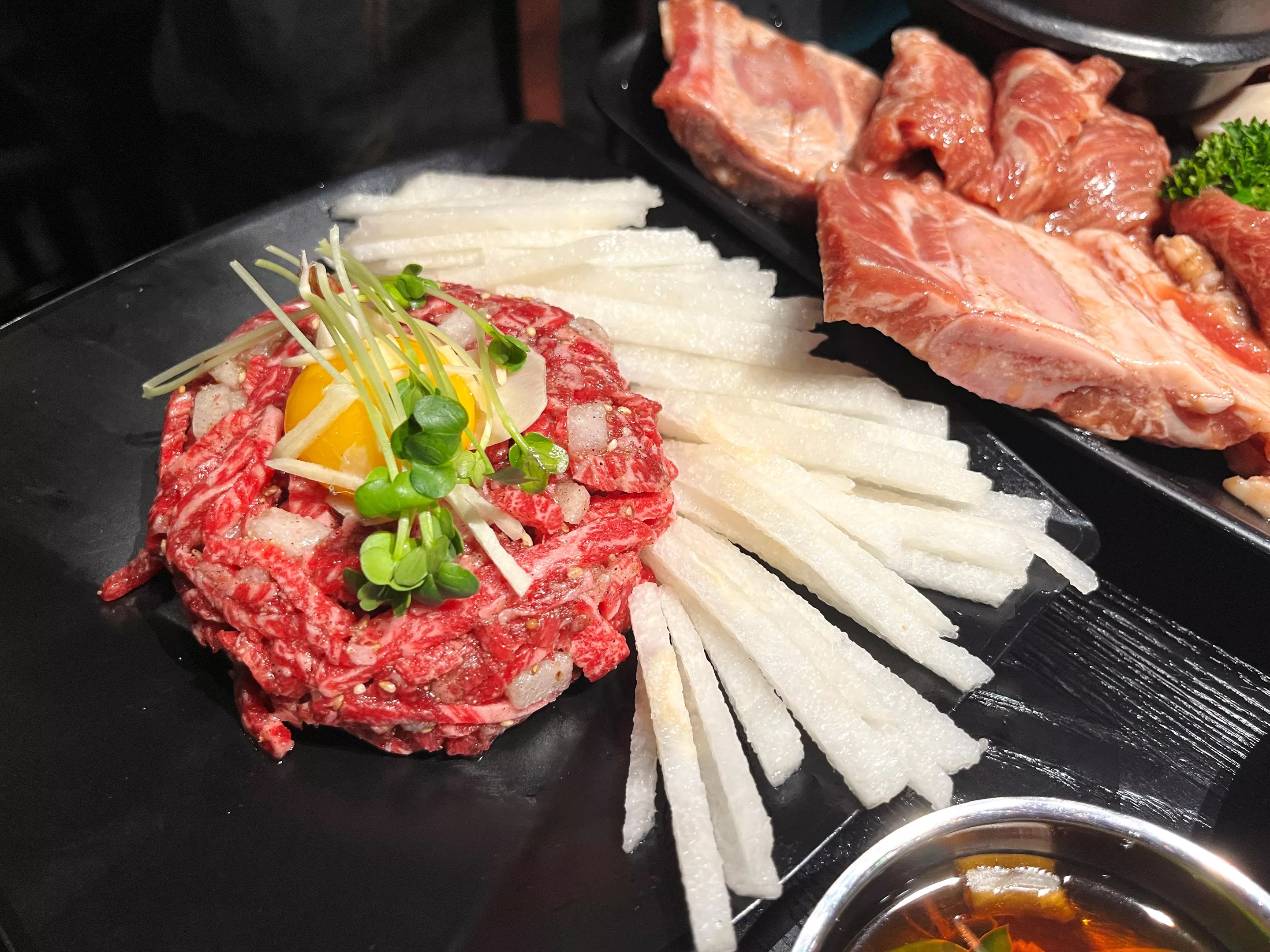Smoking Tiger offers an unusually good yukhoe — Korean beef tartare with crisp Asian pear.