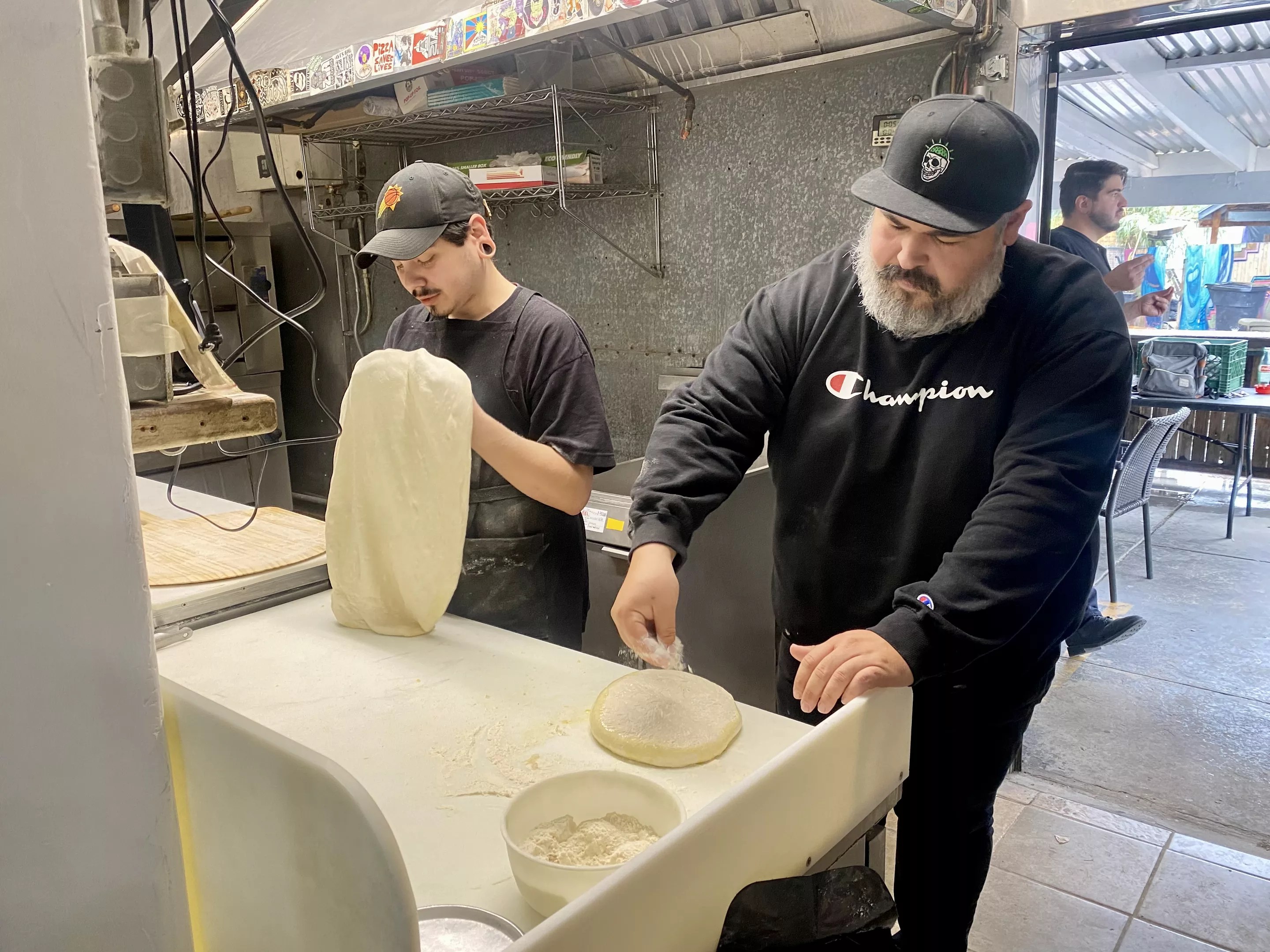 At the height of the Hungry Homie, he did five to six pop-ups per week, making 100 pizzas a night with a small crew, many of which are still part of SnapBack today. They include Christopher Benitez, the director of operations, Adam Braun, the general manager, and Santi Alvarado, the kitchen manager. Together, the men comprise a ragtag bunch with plenty of industry experience, at once goofy, yet serious about their ingredients and pies.
