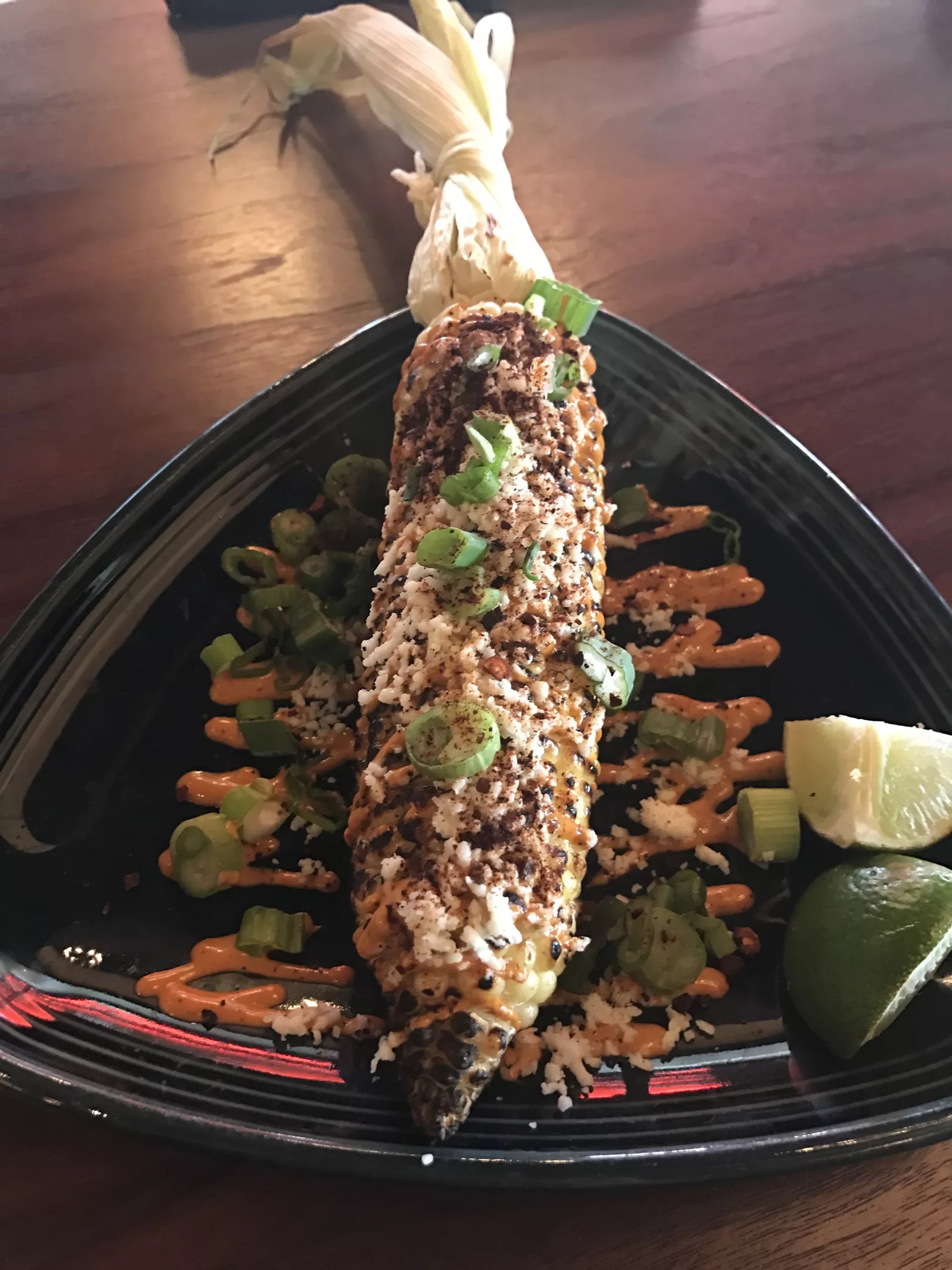 Grilled sweet corn is roasted with butter, cotija, chile, and chipotle salsa.
