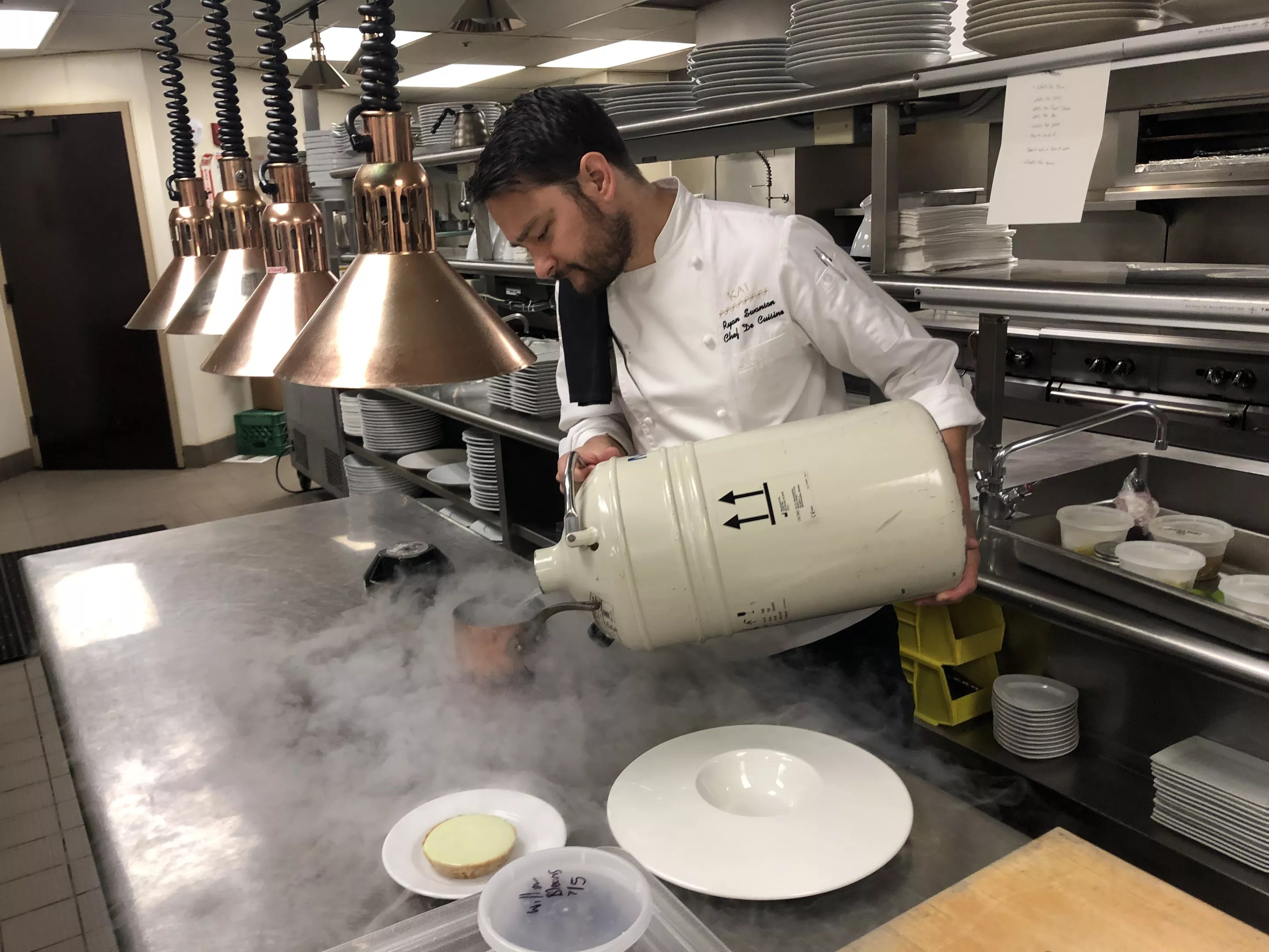 Chef Ryan Swanson uses liquid nitrogen to make prickly pear “dippin’ dots.”