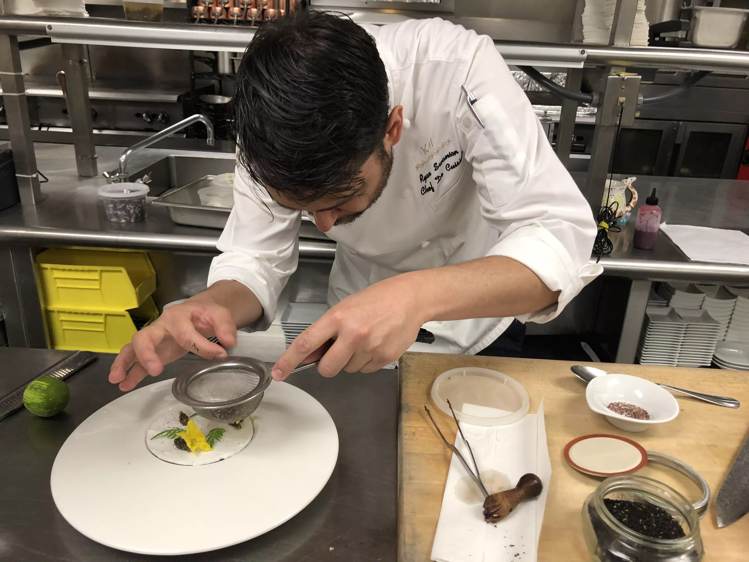 Ryan Swanson, head chef at Kai, sieves sumac-willow dust onto meringue.