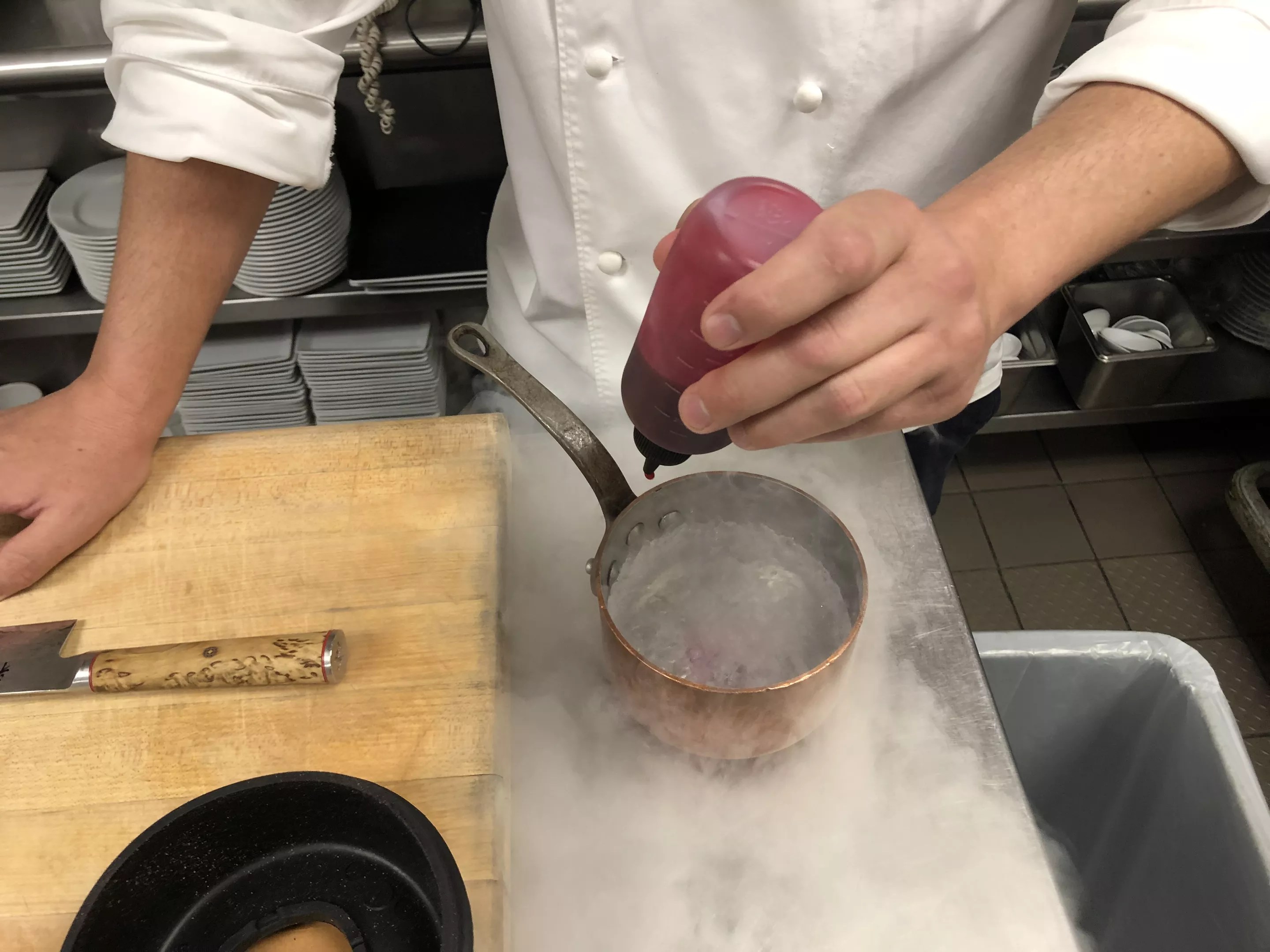 He pours. Liquid nitrogen collects in the pot. Cold fog plumes over the metal table, curls down its sides. Swanson trains his eyes on the pot, all focus focus focus, before lifting and carrying the pot back to his work station – a cutting board soon to see a motley roster of Sonoran spices, flowers, dusts, pickles …
