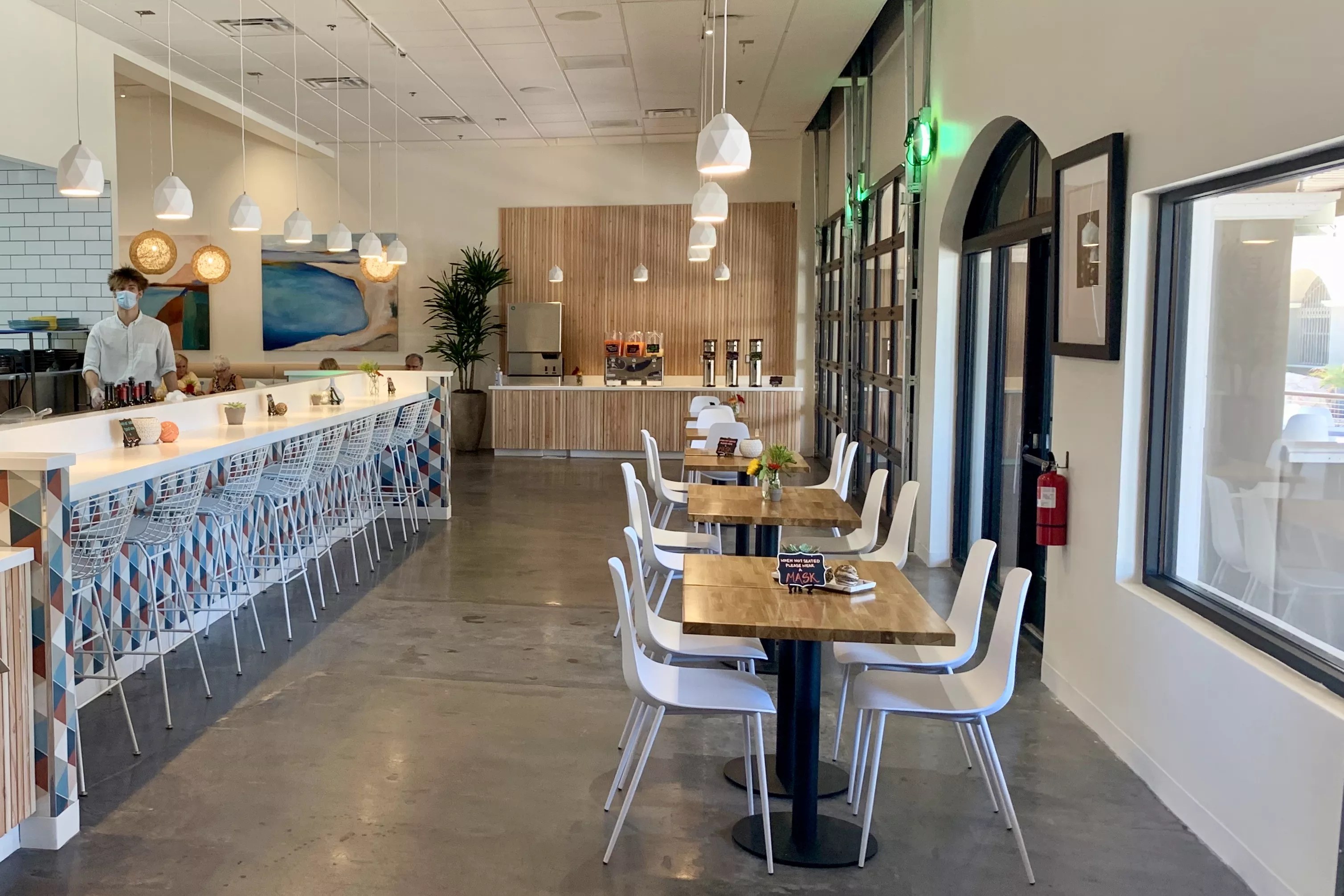 We made it there last week. At lunch, this quick-service restaurant is bright with natural light; strung-up globe lamps offer more lighting. Colorful, abstract beach paintings cover the walls. Beachwood-looking tables with white chairs are set in neat rows across from the ordering counter.
