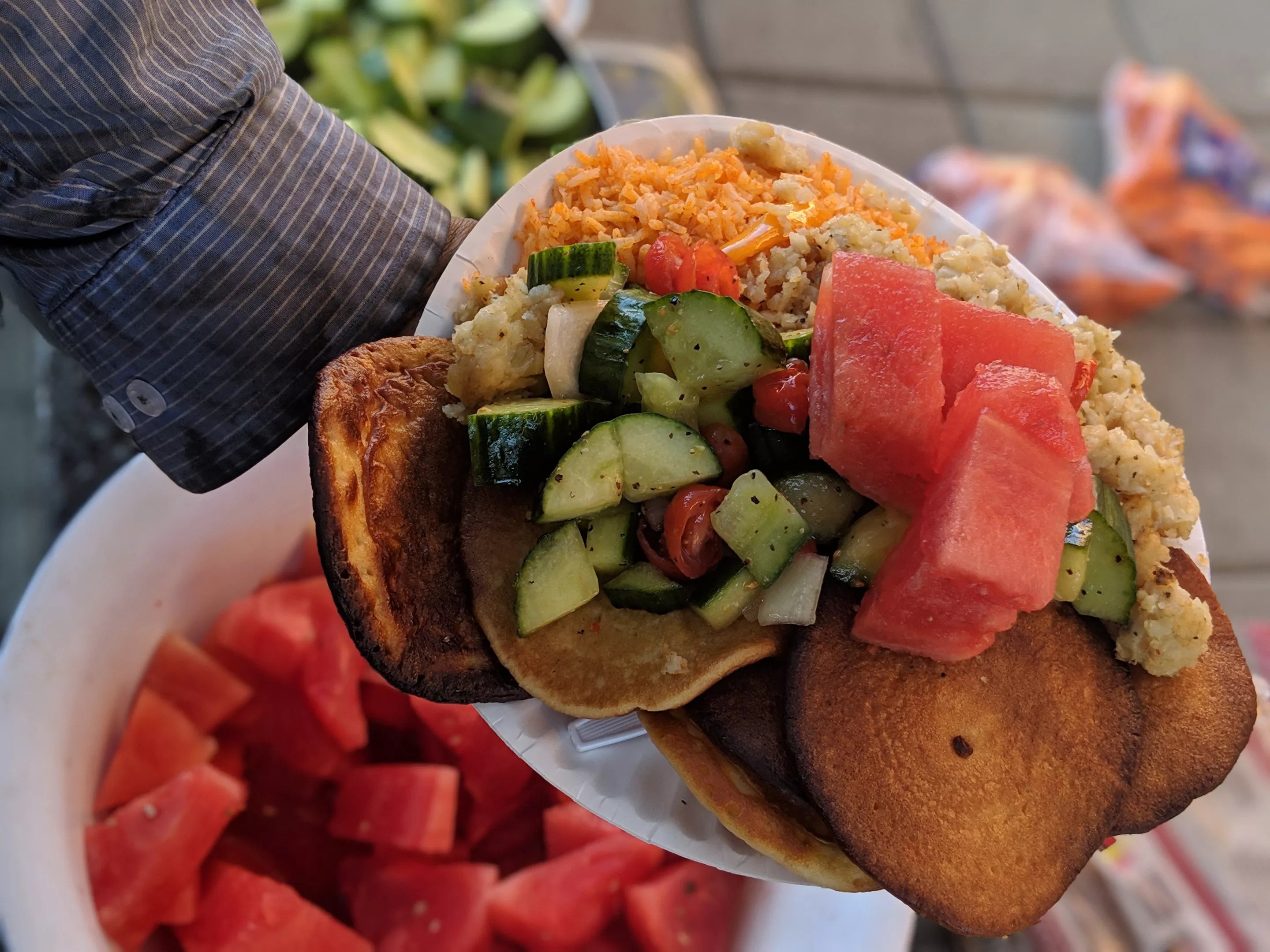 Joe speaks to why the group serves only vegetarian, sometimes only vegan, meals. He says it’s safer, for one, as many of the volunteers aren’t professionally trained in the kitchen. Two: “A big portion of the group, its members and the people who come in to join us, are vegans for some sort of ideological reason, whether it’s an ethics thing or an environmental thing.”
