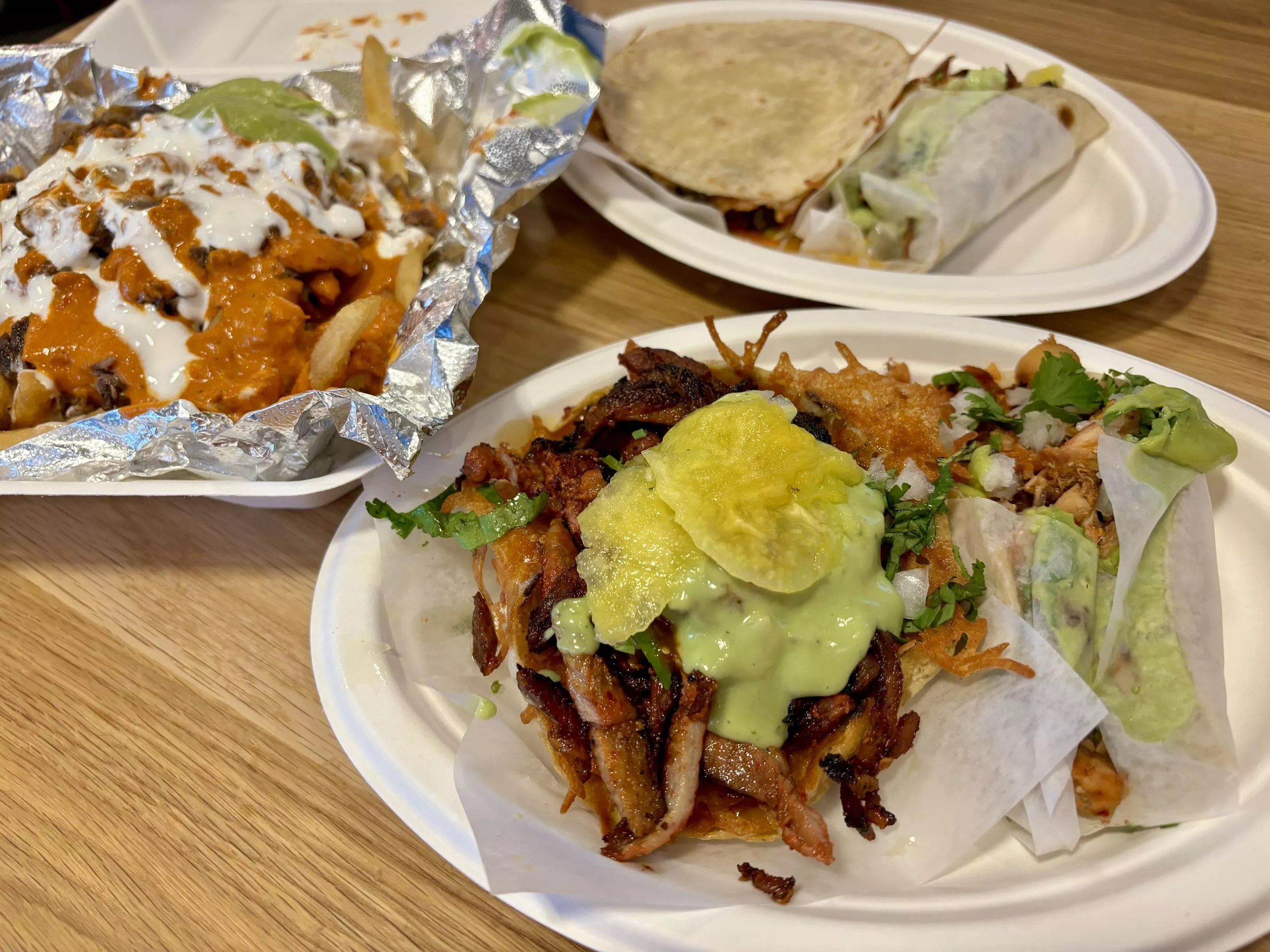 Gather yourself after eating the supremely spicy fries and enjoy the atmosphere of this fun new spot. Loud Spanish pop blares overhead and the high-energy staff serve customers while throwing in a few dance moves behind the counter. On the way out, the chorus picks back up with a collective “Buenas noches!” for every customer walking through the door.