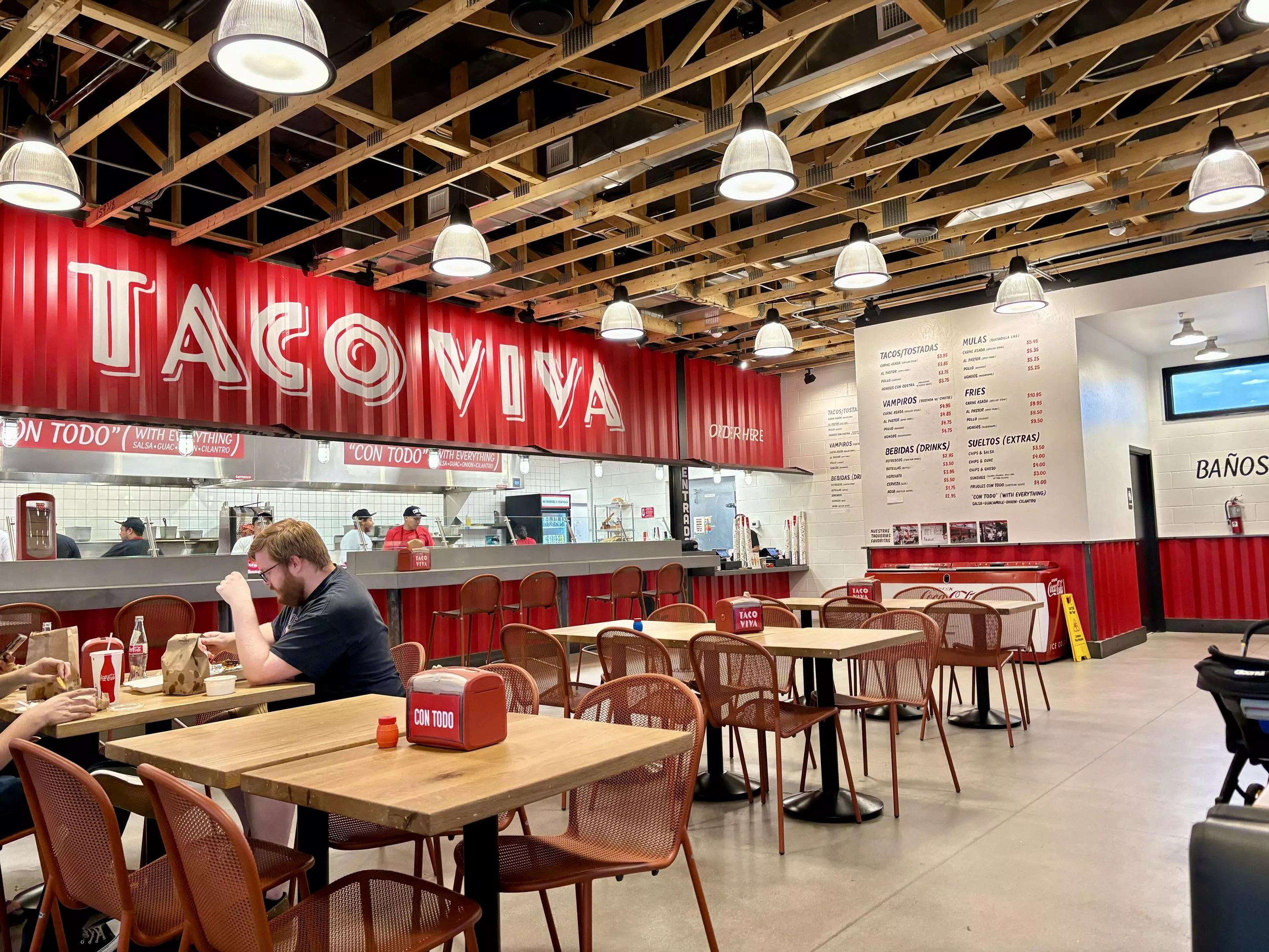 Taco Viva opened on June 22. The newly built space includes towering ceilings, a modern and bright dining room with tables and booths, a salsa bar, a section selling red and white Taco Viva merch and a drive-thru.