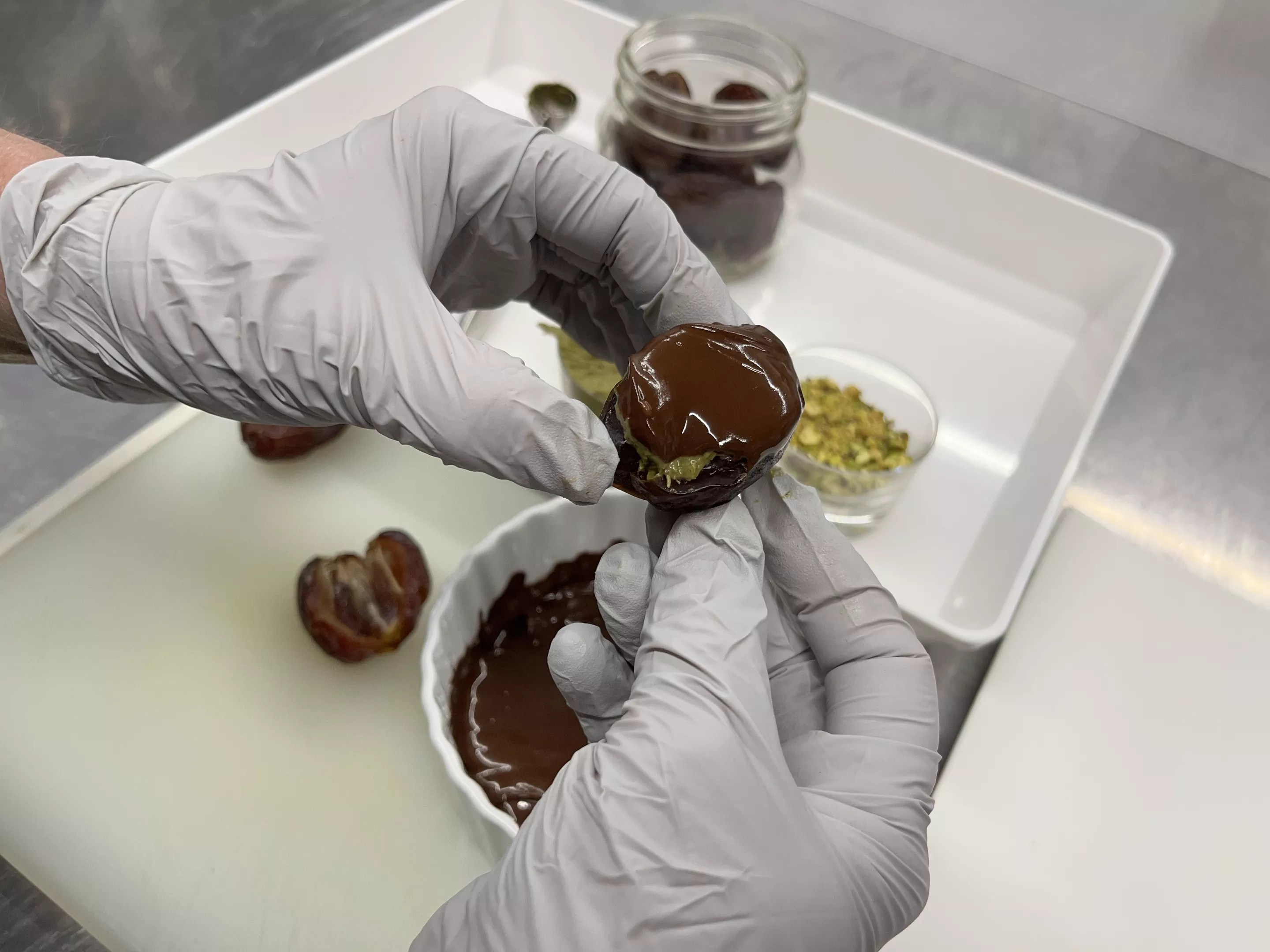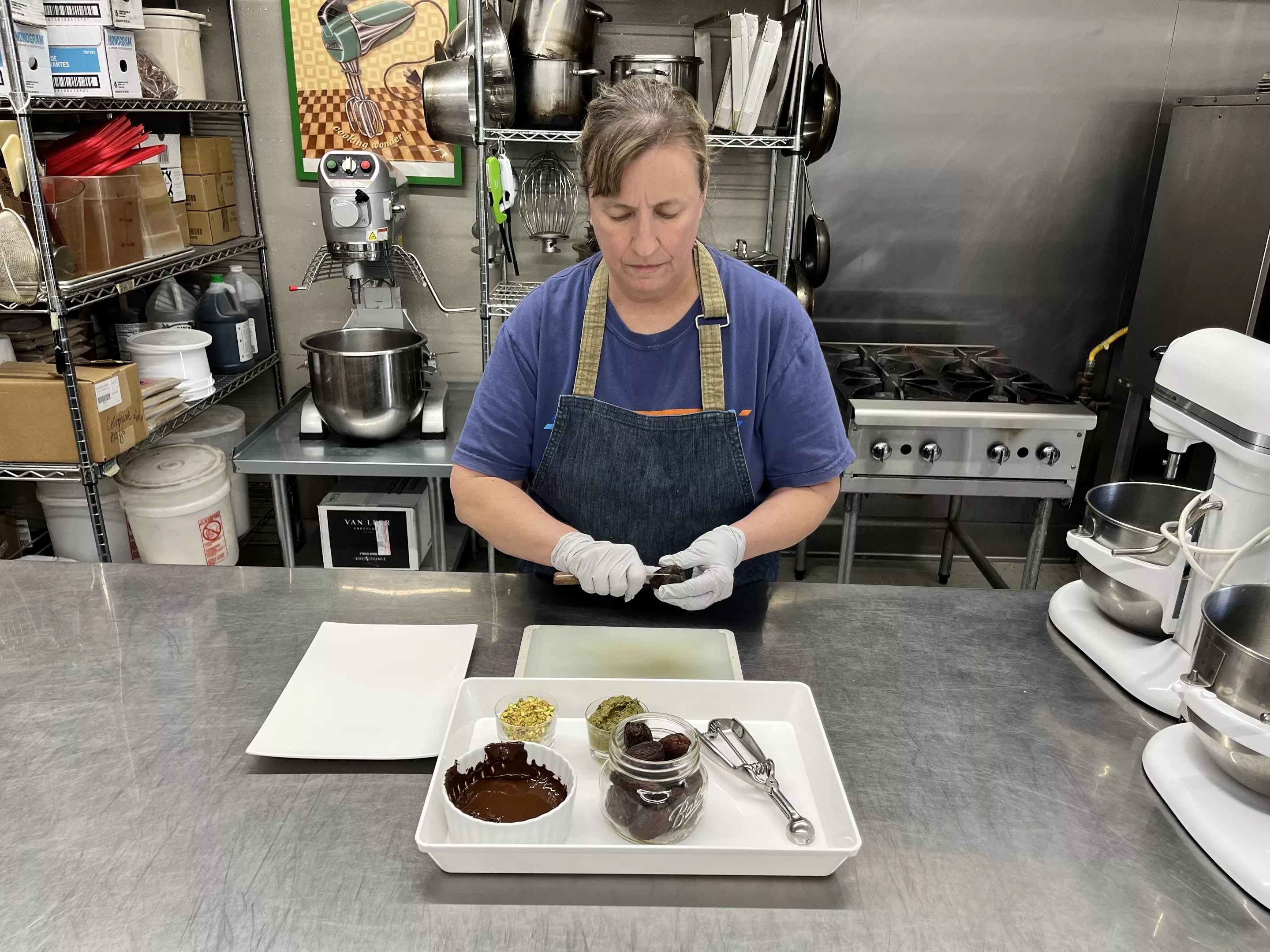 Tracy Dempsey Originals owner and pastry chef Tracy Dempsey starts the process to make her Dubai chocolate-stuffed dates.