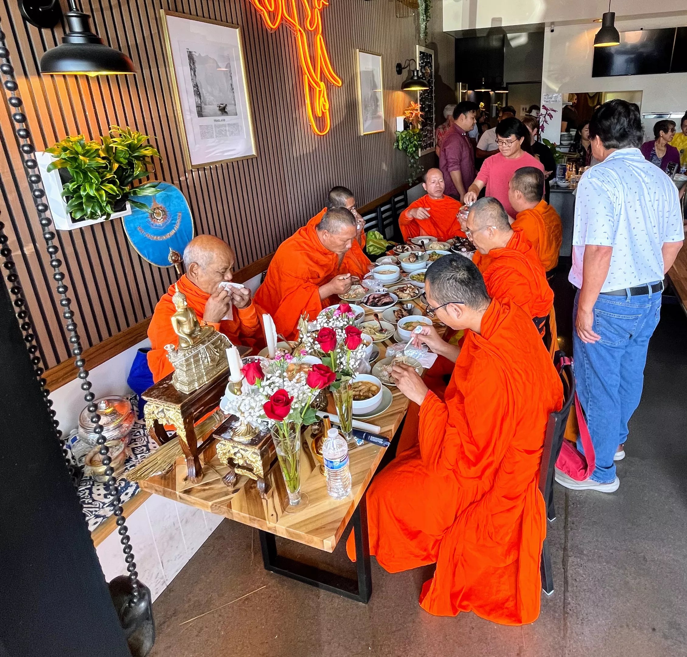Amid the soft hum of chants, seven Thai monks in vibrant orange robes blessed the restaurant with prayers and holy water. In a gesture of gratitude, Pluemjit presented the monks with an alms donation.