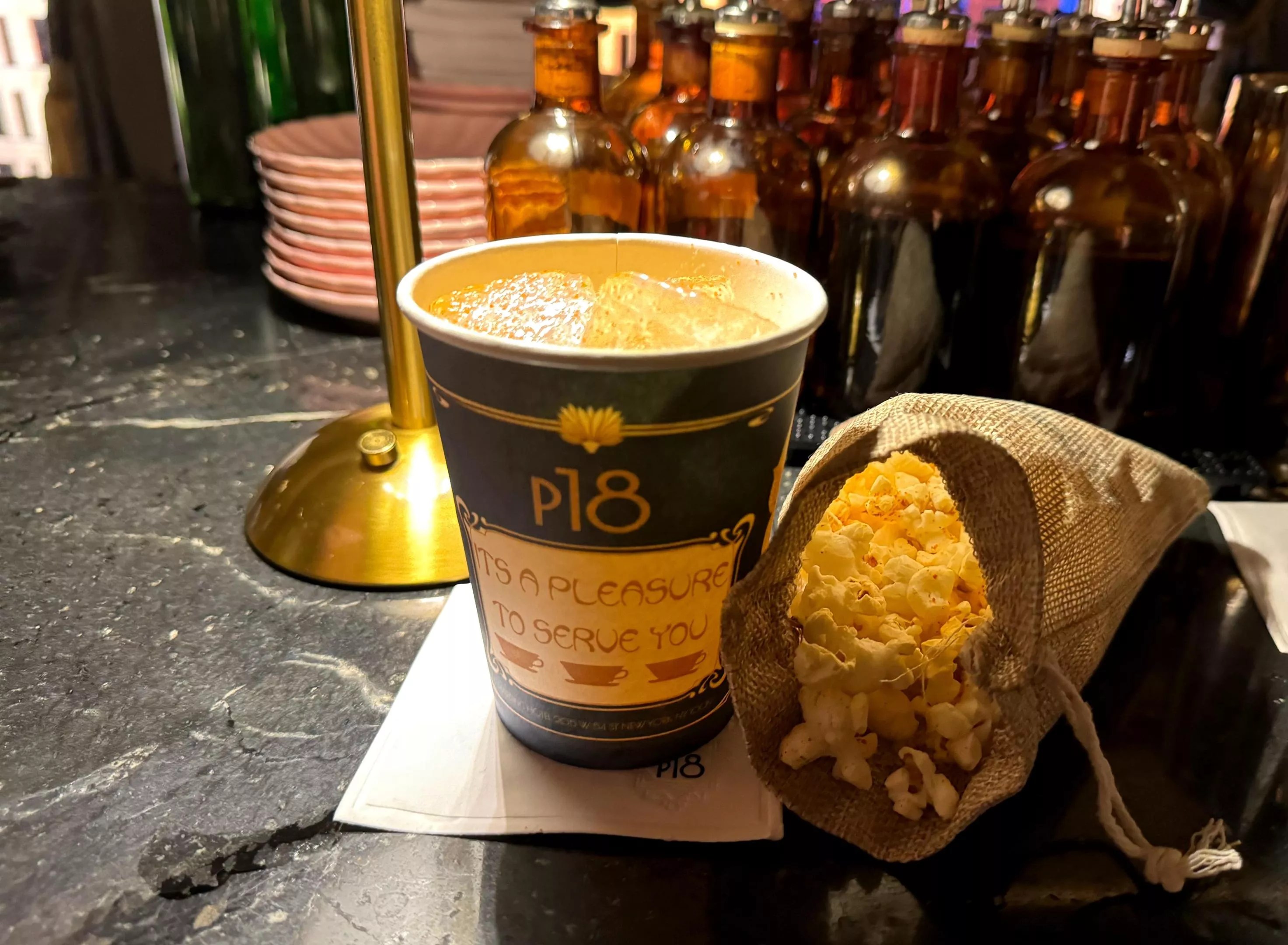 The 54th Street Club riffs on a spicy margarita, using popcorn-infused tequila, Cointreau and lime juice with togarashi and pandan. The drink is served in a New York-inspired to-go coffee cup alongside a bag of togarashi-dusted popcorn.