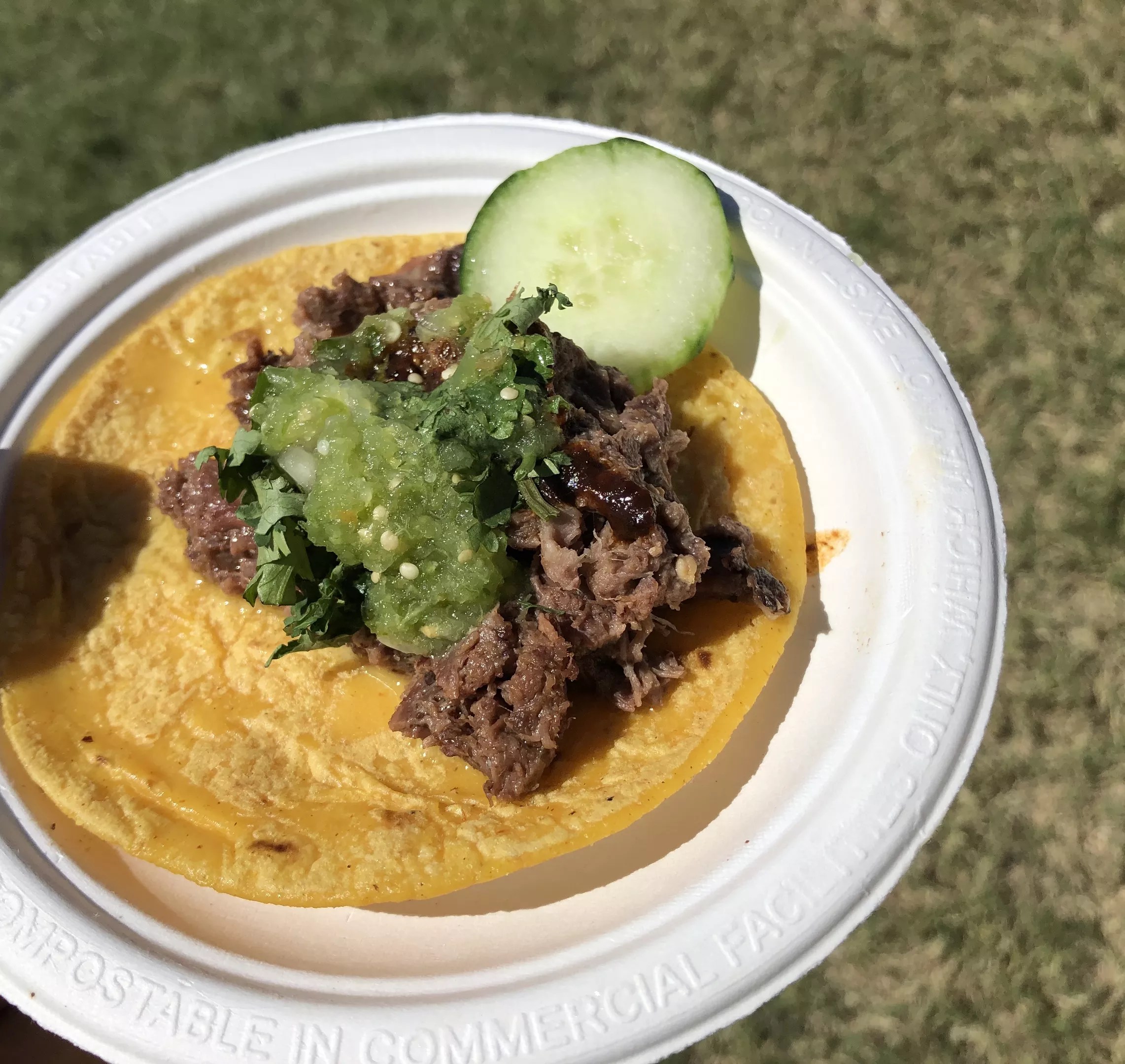 Over at Taco Chelo, meat was being stripped from a cattle skull, horns jutting. Once tucked into a corn tortilla, the beef head barbacoa had a slight mineral tone. It disappeared with a lush creaminess softer than even the tortilla. Natural head fat. Long cooking. An epic spread of salsas, the green introducing a zinging counterpoint. This is the kind of taco you go to a taco festival to enjoy.