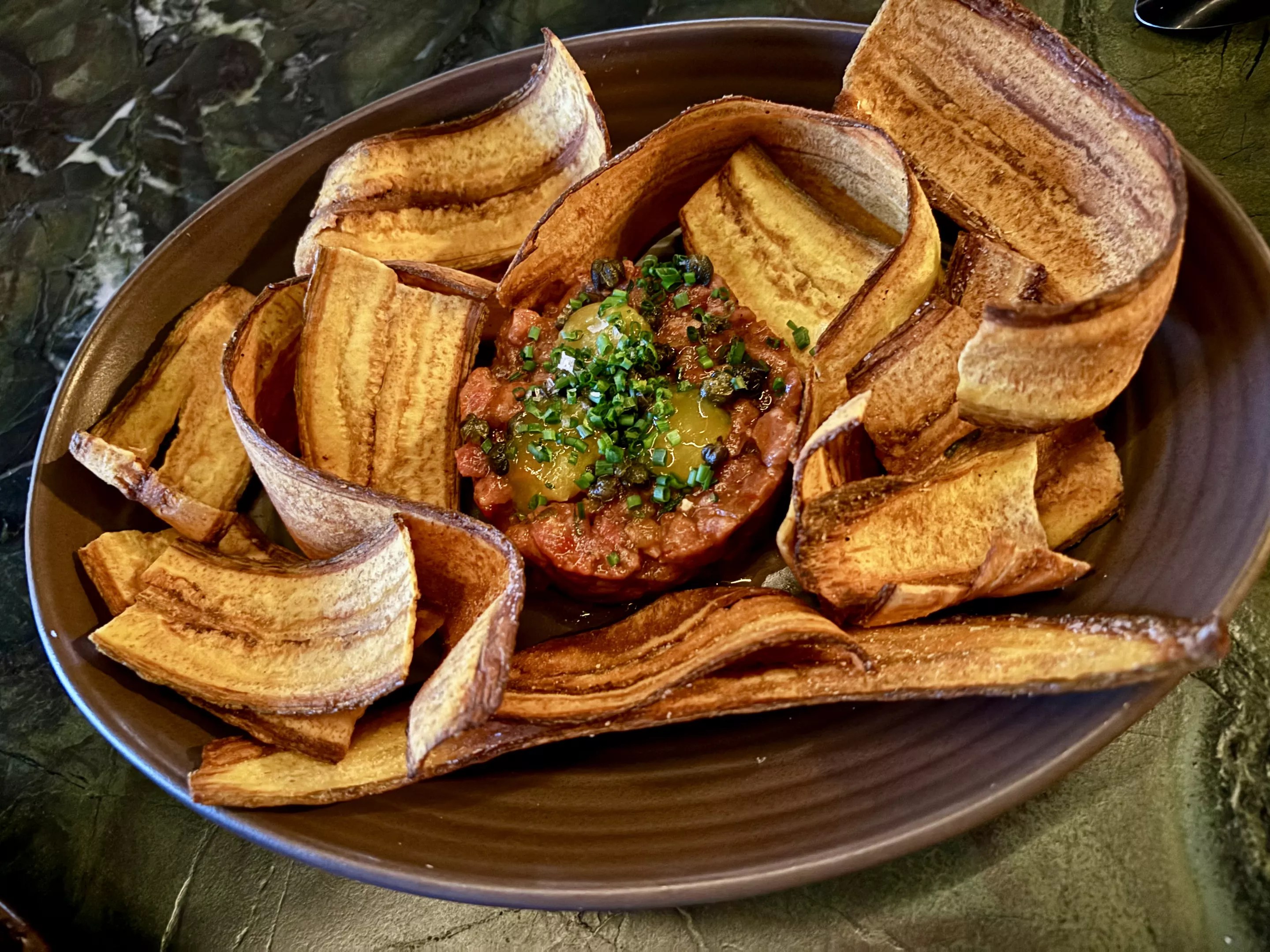 1327 E. Chandler Blvd., #108, Phoenix In Ahwatukee, the tables at El Fogón Taqueria are always full. This neighborhood destination is loved for its creative tacos, hearty plates and refreshing cocktails. Just next door, two small entryways lead to an additional space, serving sweets and snacks. There, a machine is devoted to cranking out fresh mango sorbet. This is the base of a few different desserts, including an exceptional rendition of a classic mangonada. The sorbet is swirled into a plastic cup, layered with tangy chamoy. On top, fresh mango cubes mingle with tamarind candies, more sticky chamoy and candied peanuts. The whole thing is topped off with a tamarind-covered straw and a spoon. The sweet fruit, spicy candies, tangy sauce and crunchy, creamy peanuts blend to create the perfect bite. Smoky steak, a bright citrusy marinade and sweet and salty plantain chips all work together to create a delicious bite in Filthy Animal’s Wood-Fired Beef Tartare. Tirion Boan