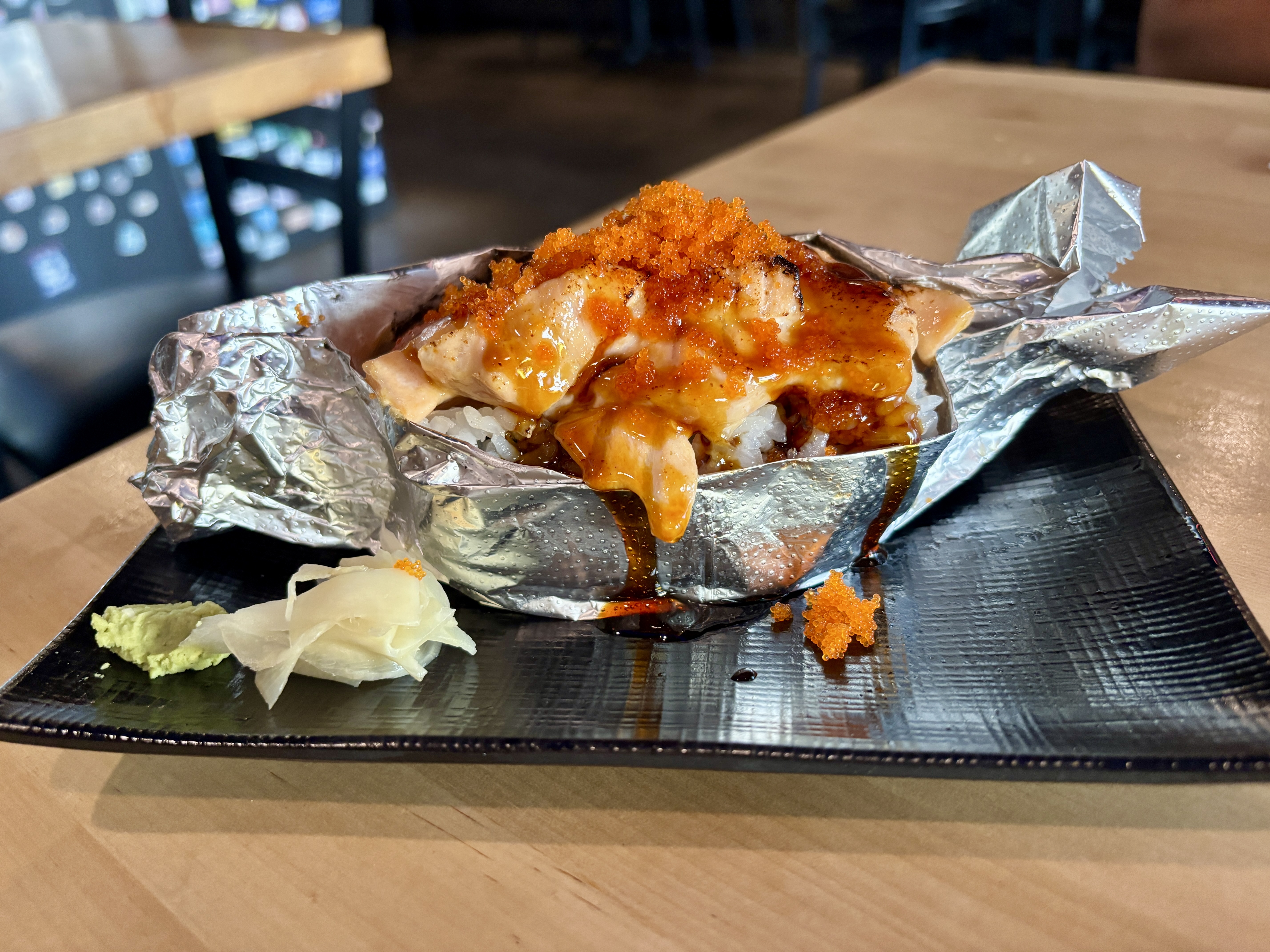 The Lion King Roll at King Salmon is baked and served in a tin foil boat.