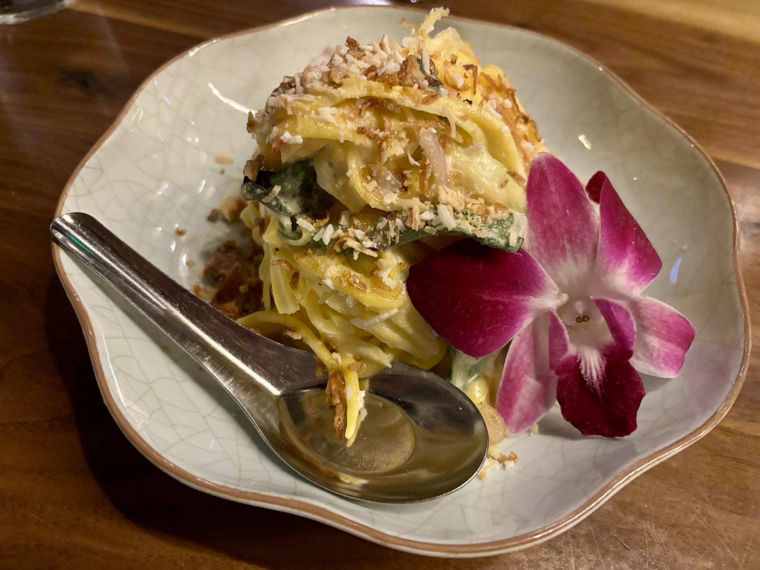 218 E. Portland St. The Yam Mamuang Boran isn’t new at downtown Phoenix’s regional Thai restaurant Lom Wong. But we were recently reminded of just how delicious this fresh mango salad really is. Shaved green mango strands mingle with hand-torn shrimp and are bathed in a sauce made with coconut cream, lime and fish sauce that explodes with flavor in each bite. It’s sweet, sour, tangy and intensely flavorful. Peanuts on top add a creamy, earthy note that grounds the bright flavors of this refreshing salad.