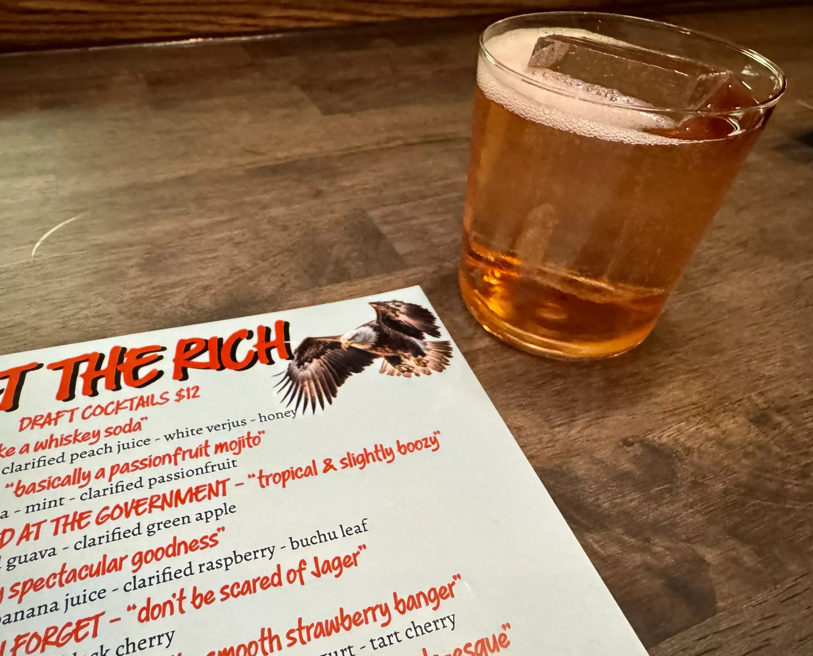 Eat the Rich is the latest bar from the team behind fellow cheekily-named Roosevelt Row bars, Killer Whale Sex Club and F.Y.P.M. It opened quietly in January in the former space of Pretty Penny. The spot on Roosevelt and Fifth streets has been home to several short-lived bars. With exceptionally made, technique-driven cocktails being poured on draft for just $12 a pop, we’re really crossing our fingers that this one sticks. The concept and drink names lean into the chaotic political moment we’re in by poking fun and raising some eyebrows. This meme-referencing cocktail is made with Calvados apple brandy, Cocchi Americano, and clarified guava and green apple juices. The drink is carbonated, arriving with a small head of bubbles. The apple and effervescence took us back to a childhood place of Martinelli’s Sparkling Apple Juice, in a delightful, slightly tropical, boozier way.