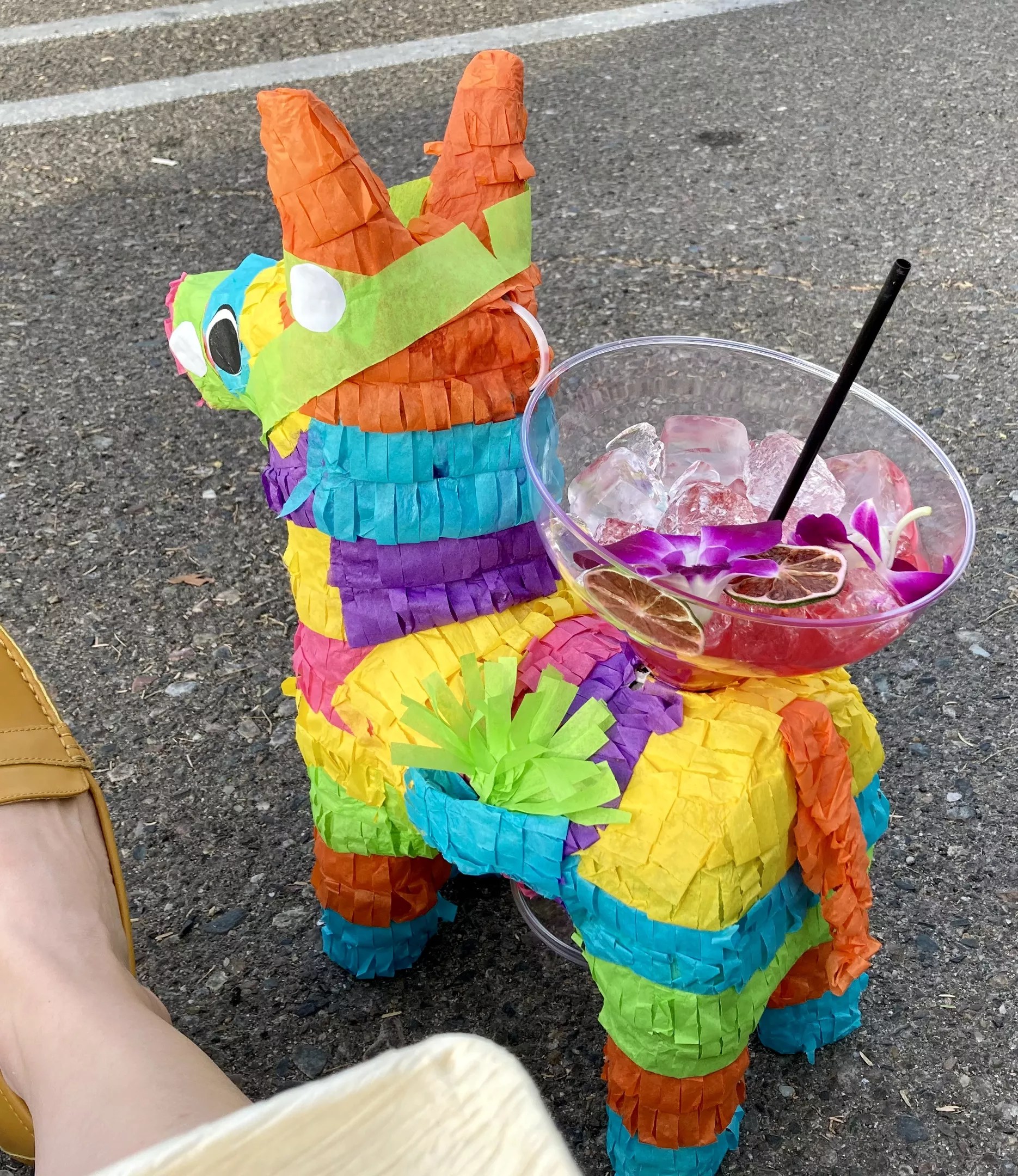 Additional drink options include Mexican beer on draft and (strong) margaritas, the glasses of which are placed inside a personal pinata (we can only direct you to this accompanying photo for further explanation).