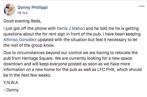 The post reads, “Due to circumstances beyond our control we are having to relocate the pub from Heritage Square. We are currently looking for a new space downtown and will keep everyone posted as soon as we have more information on a new home for the pub as well as LFC PHX, which should be in the next few weeks.”