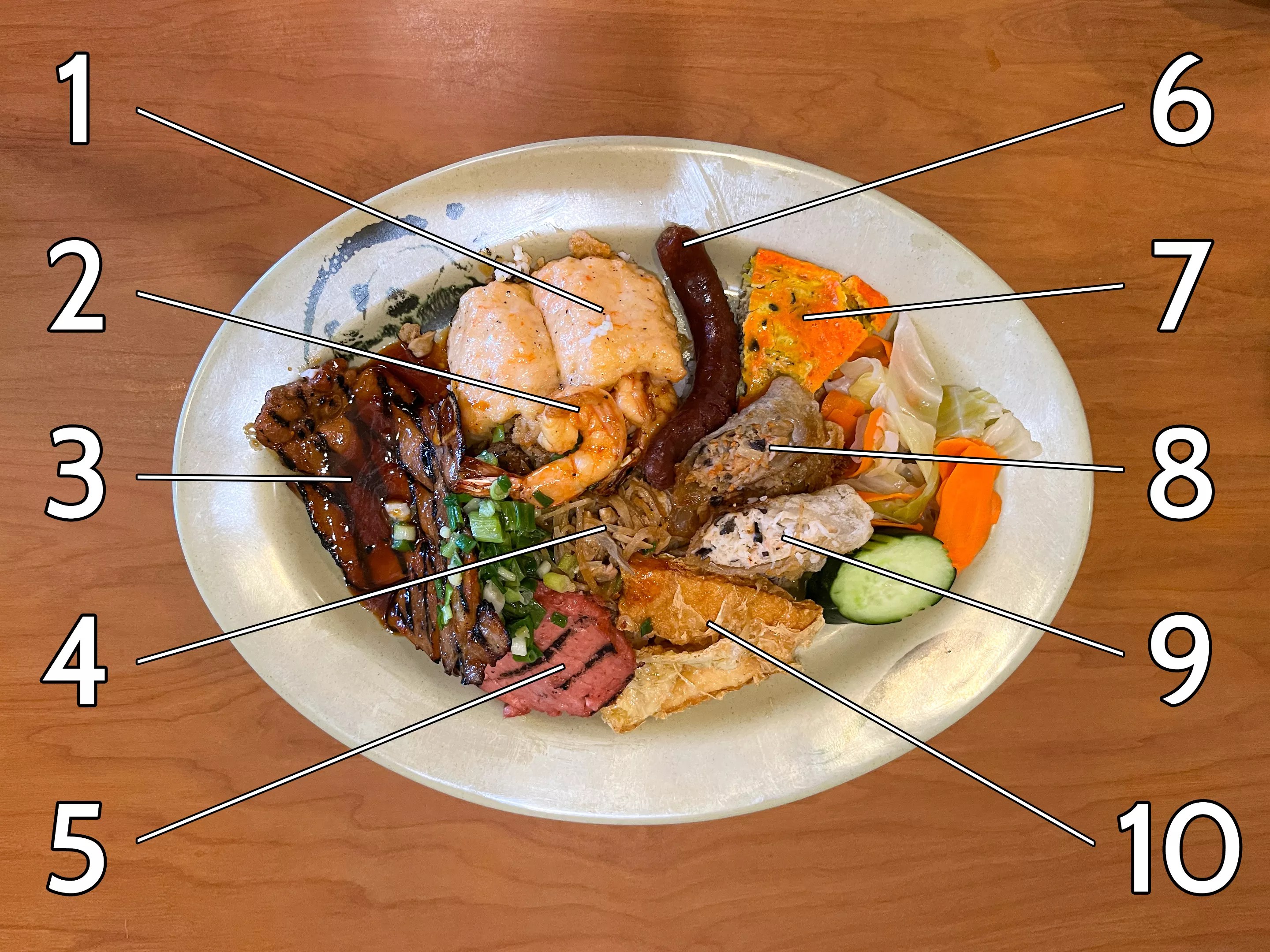Lastly, you’ll find two types of fried roll: cha gio thit (8) and cha gio tom (9), filled with pork and shrimp, respectively. Most restaurants around town will wrap these in spring roll wrappers, but like many Vietnamese joints, Com Tam Thuan Kieu opts for rice paper – the same kind of supple, pale white wrappers used for fresh spring rolls – that crackles and takes on a kind of wild, chewy-crisp texture when it’s fried, punctuated by blistered bubbles of fried rice.