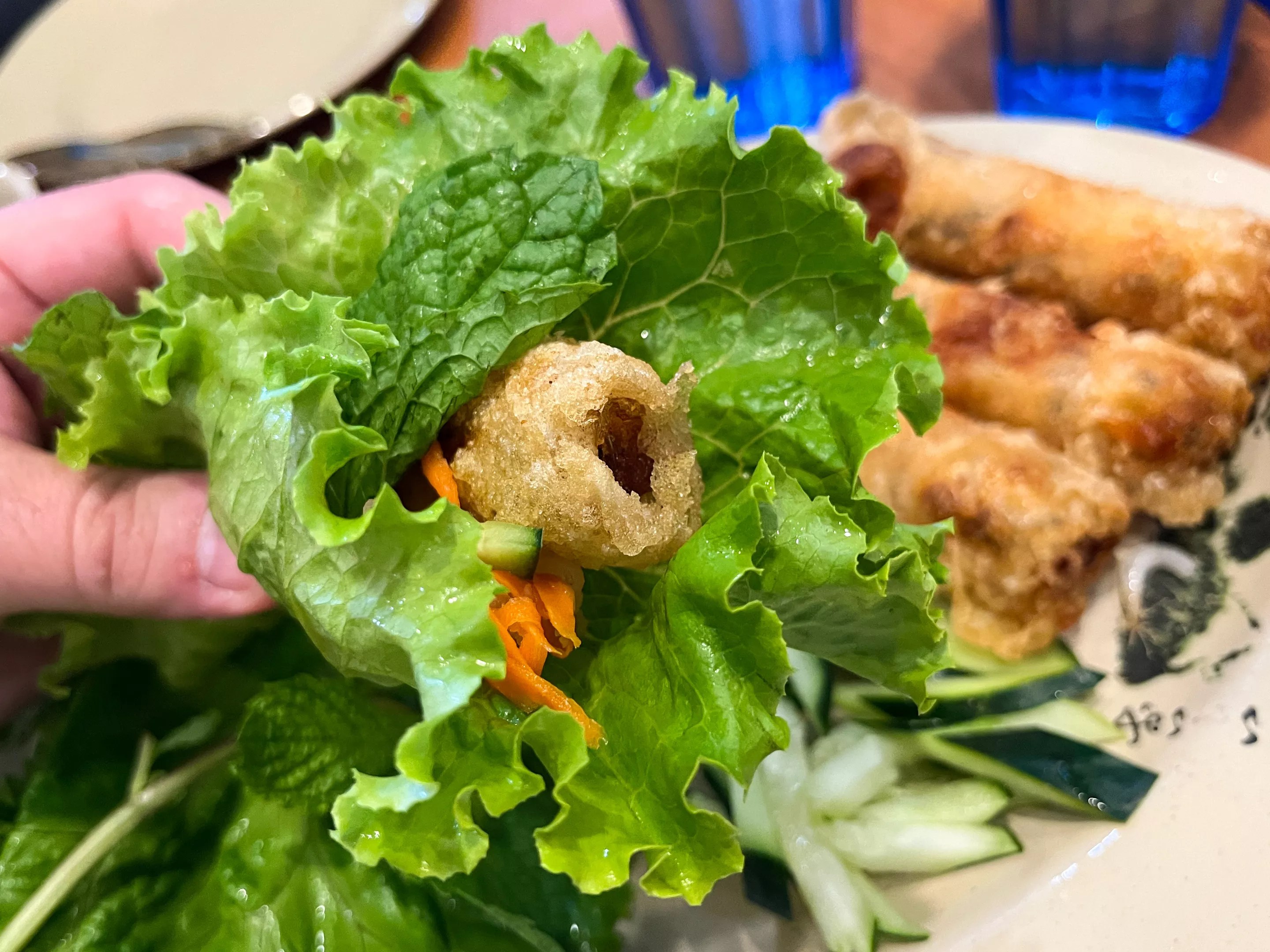 The cha gio — like many dishes at Com Tam Thuan Kieu — are served with lettuce and garnishes for wrapping and dipping.