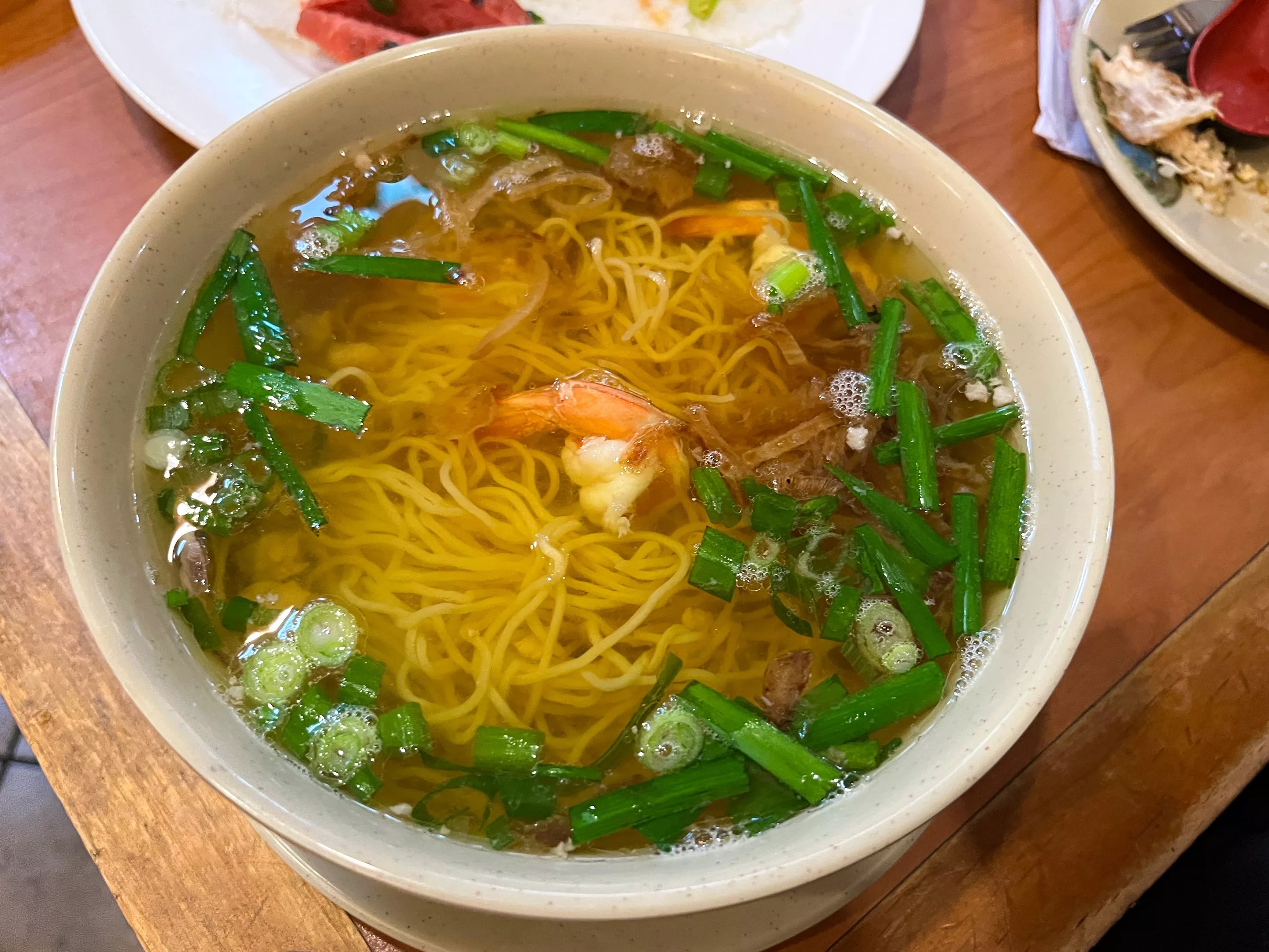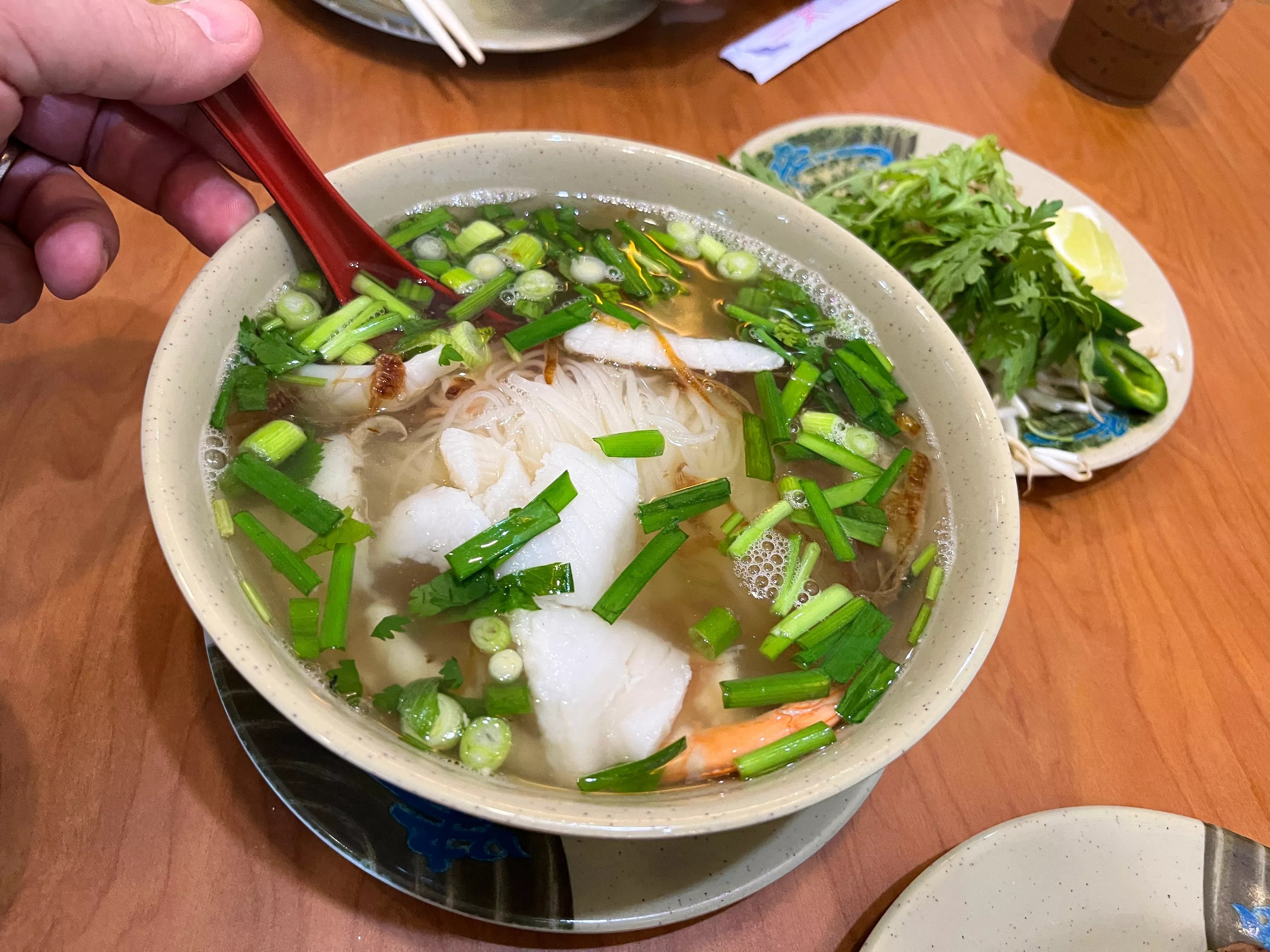 Hu tieu do bien sports thin rice noodles, a lighter broth and a mix of fish and calamari.