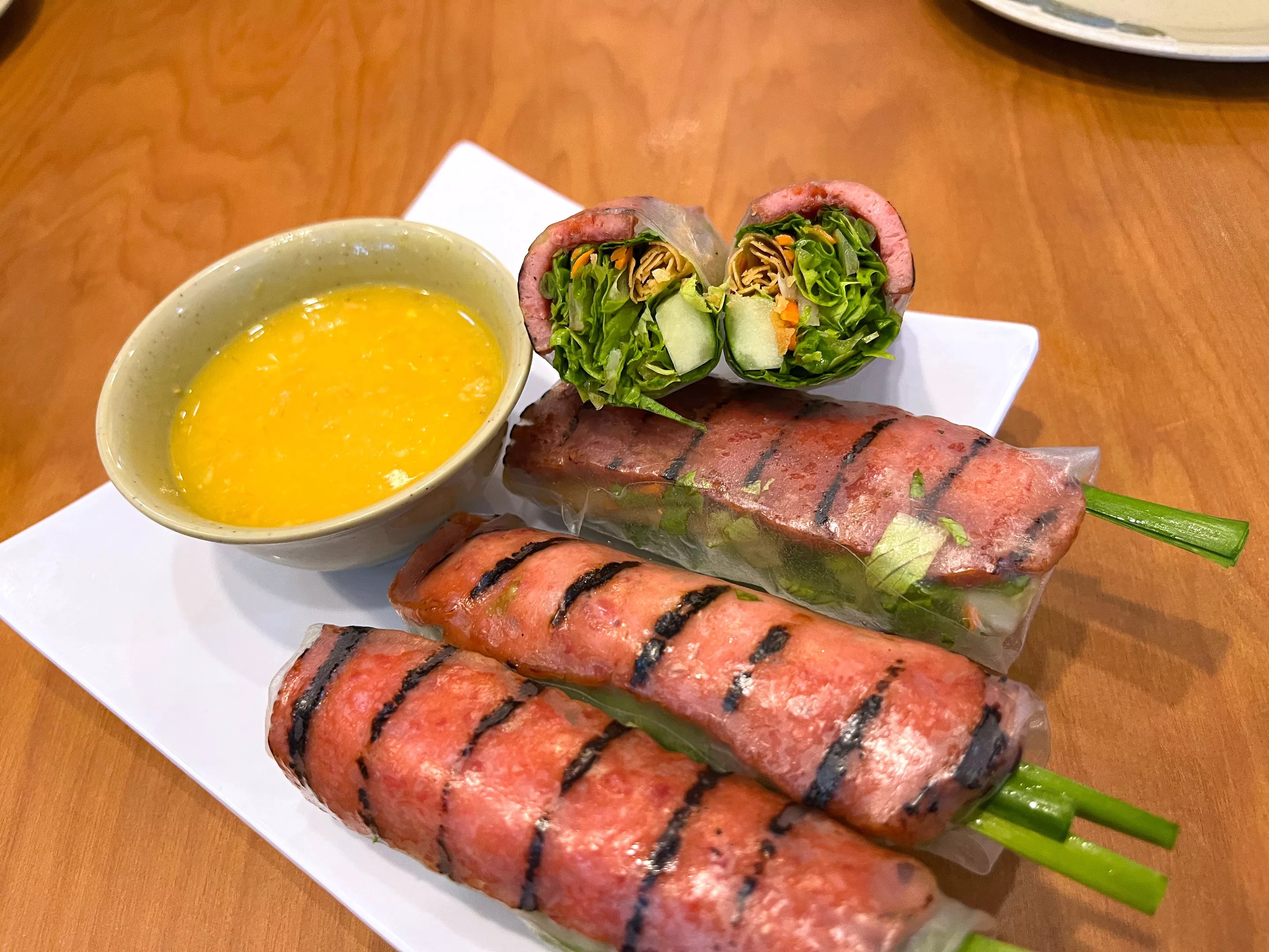 Phan nem nuong nha trang cuon are some of the best fresh rolls on the menu, served with a salty-sweet crab dip.